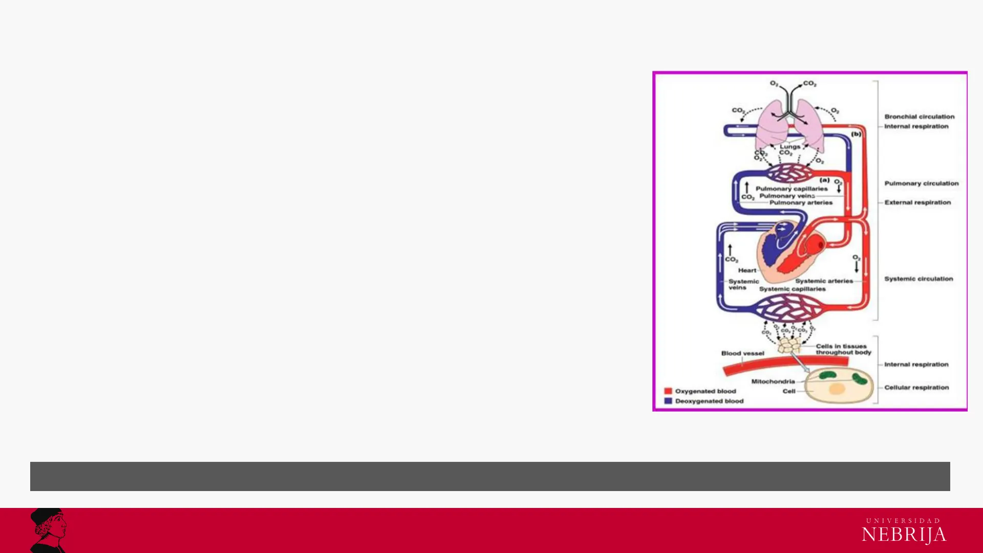 co2 CO2 .***** Bronchial circulation Internal respiration (b) Lungs co O. (a) o Pulmonary circulation 1 Pulmonary capillaries CO2 Pulmonary veins Pulmonary arteries External respiration 1 CO - Heart Systemic veins Systemic capillaries Cells in tissues throughout body Blood vessel -Internal respiration Mitochondria Cell Cellular respiration Oxygenated blood Deoxygenated blood UNIVERSIDAD NEBRIJA 2