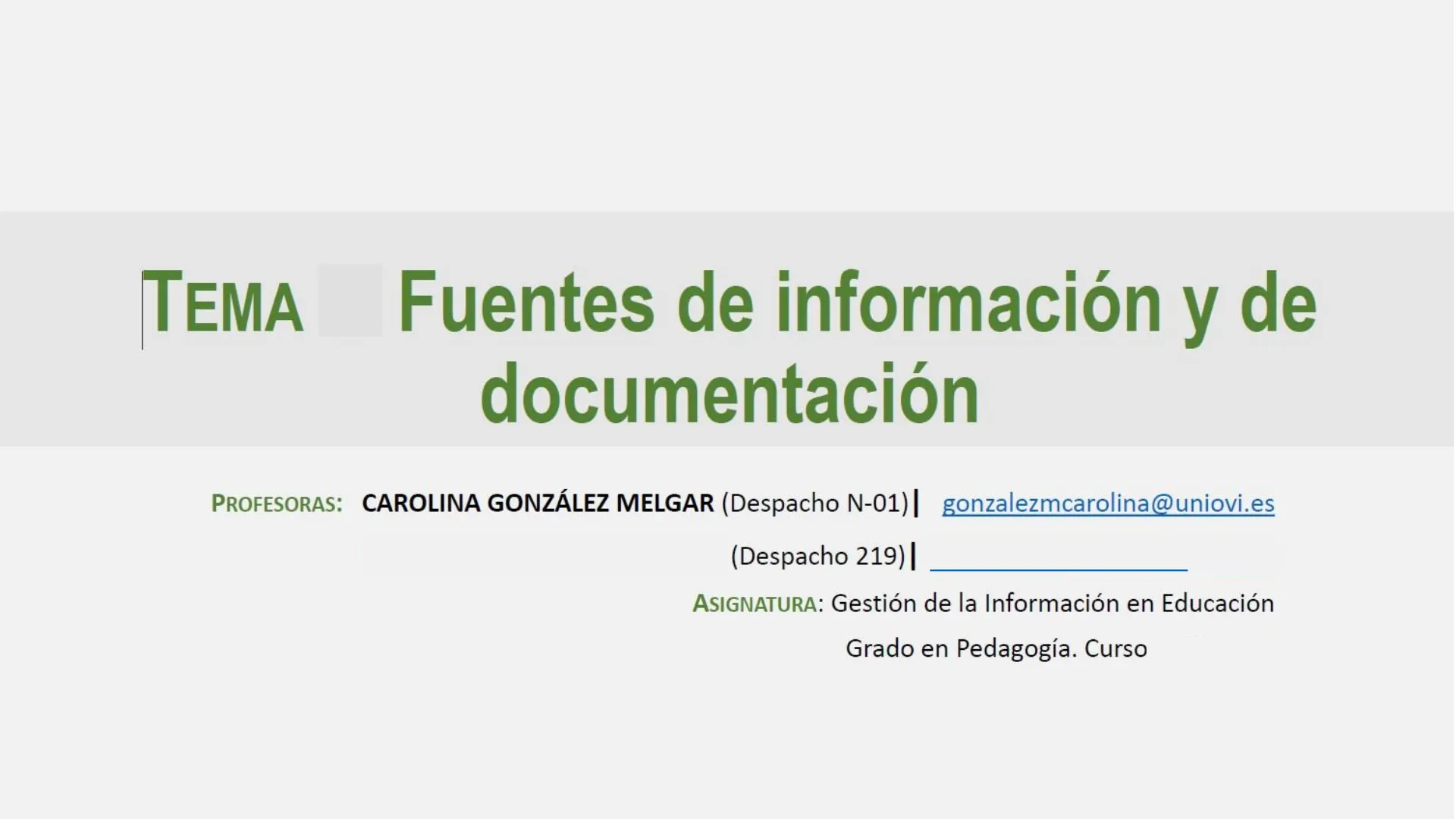 PROFESORAS: CAROLINA GONZÁLEZ MELGAR (Despacho N-01) | gonzalezmcarolina@uniovi.es SUÉ GUTIÉRREZ BERCIANO (Despacho 219) | gutierrezsue@uniovi.es ASIGNATURA: Gestión de la Información en Educación Grado en Pedagogía. Curso 2022-2023