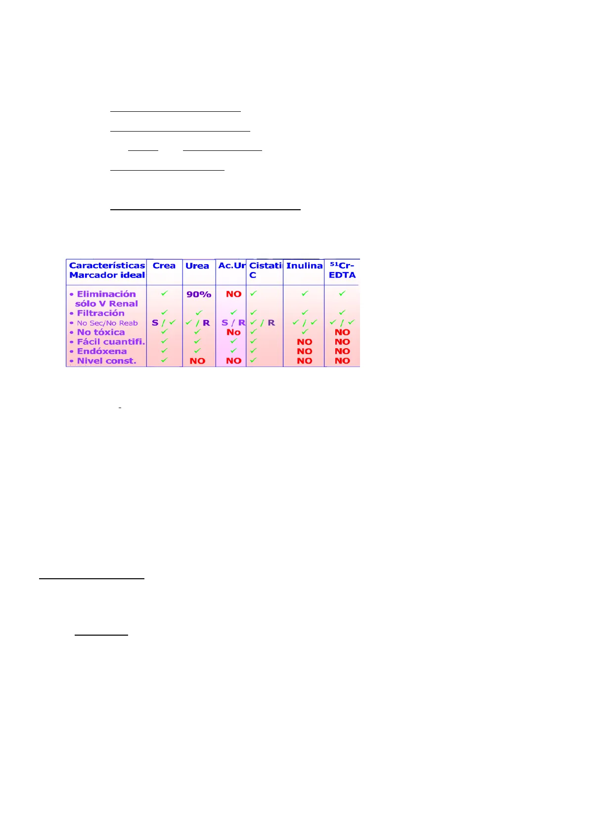 Características Marcador ideal Crea Urea Ac.Ur Cistati Inulina C 51Cr- EDTA · Eliminación sólo V Renal 90% NO V · Filtración · No Sec/No Reab S / V V / R S/R V / R · No tóxica No · Fácil cuantifi. · Endóxena . Nivel const. NO NO NO NO NO NO NO NO NO