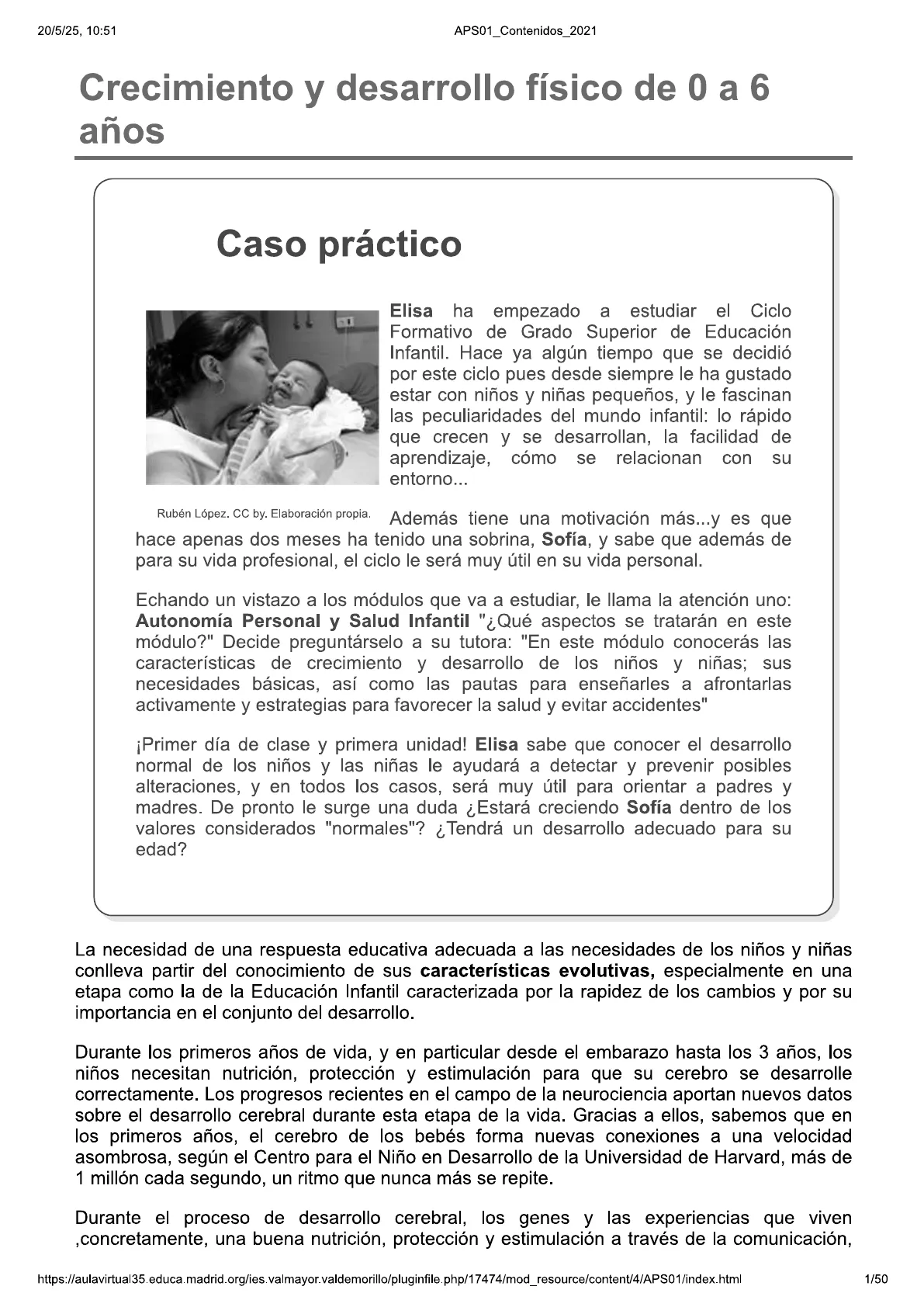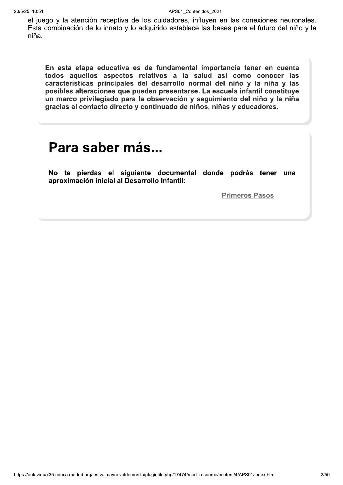 No te pierdas el siguiente documental donde podrás tener una aproximación inicial al Desarrollo Infantil: Primeros Pasos https://aulavirtual35.educa.madrid.org/ies.valmayor.valdemorillo/pluginfile.php/17474/mod_resource/content/4/APS01/index.html 2/5020/5/25, 10:51 APS01_Contenidos_2021