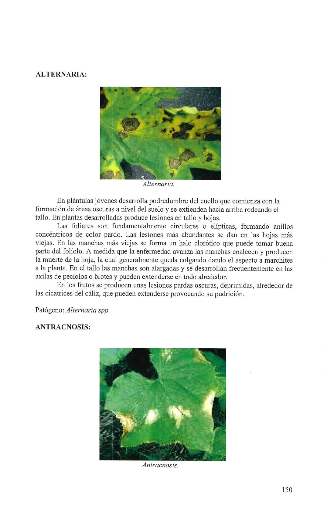 149Preparación Oposición Operario/a Agroganadero/a y Obras Públicas Alternaria. En plántulas jóvenes desarrolla podredumbre del cuello que comienza con la formación de áreas oscuras a nivel del suelo y se extienden hacia arriba rodeando el tallo. En plantas desarrolladas produce lesiones en tallo y hojas. Las foliares son fundamentalmente circulares o elípticas, formando anillos concéntricos de color pardo. Las lesiones más abundantes se dan en las hojas más viejas. En las manchas más viejas se forma un halo clorótico que puede tomar buena parte del folíolo. A medida que la enfermedad avanza las manchas coalecen y producen la muerte de la hoja, la cual generalmente queda colgando dando el aspecto a marchites a la planta. En el tallo las manchas son alargadas y se desarrollan frecuentemente en las axilas de pecíolos o brotes y pueden extenderse en todo alrededor. En los frutos se producen unas lesiones pardas oscuras, deprimidas, alrededor de las cicatrices del cáliz, que pueden extenderse provocando su pudrición.