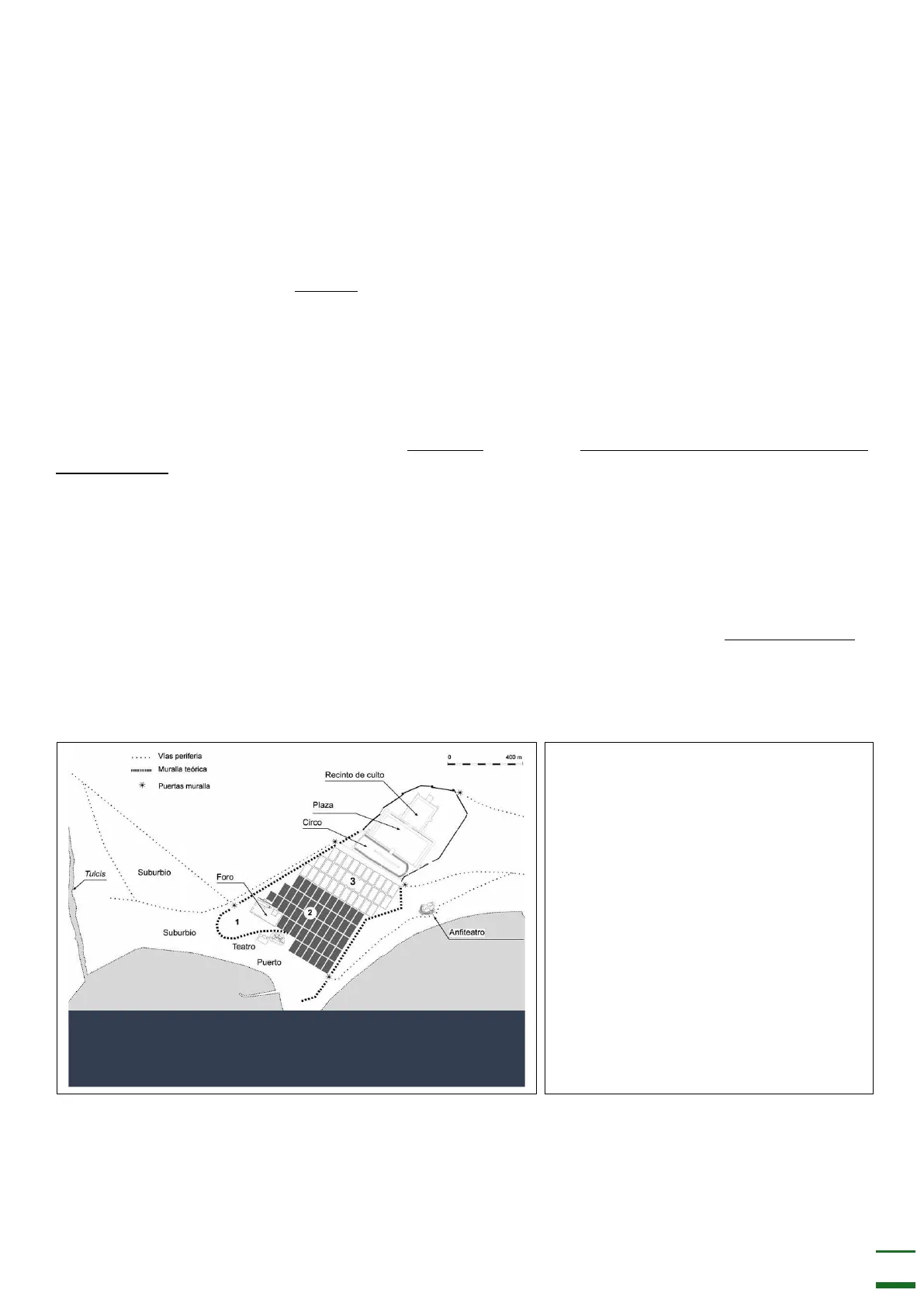 La culminación de la conquista, tras el desenlace de las guerras cántabras (29-19 a.C.) abrió un periodo de bonanza que se tradujo en un fuerte desarrollo urbano, secundado por la construcción de grandes estructuras tanto de comunicación como hidráulicas, al tiempo que se operó una profunda organización administrativa. A las dos provincias Hispania Ulterior y Citerior se le sumo otra Lusitania, con capital en Emerita Augusta. Siguiendo un orden jerárquico después de las capitales de provincia, vendrían las ciudades que atendieron el ejercicio periódico de la justicia, sedes de conuentus iuridicis, que también desempeñaron un papel fundamental en la vertebración del territorio. Vías periferia 0 400 m Muralla teórica Recinto de culto * Puertas muralla Plaza Circo Tulcis Suburbio Foro 3 2 1 Suburbio Anfiteatro Teatro Puerto Plano de Tarraco a inicios del s. II d. C. 1, ciudadela ibérica romanizada. 2, ensanche urbanístico entorno el 100 a.C.y retícula urbana definida arqueológicamente. 3, posible ensanche urbanístico época cesar-augustea y retícula urbana indefinida A continuación, estarían las ciudades que, al margen de su estatuto jurídico, experimentaron procesos de desarrollo monumental de gran magnitud, que en ocasiones se adelantaron a la promoción jurídica, cuya estructura urbana incluiría el viario y la red de saneamiento, los espacios públicos y privados, así como su entorno suburbano. Ejemplo de transformación de oppidum indígena es Conimbriga (Coimbra), iniciada por Augusto y terminada en época Flavia. Distintos procesos a diferente ritmo según los casos.
