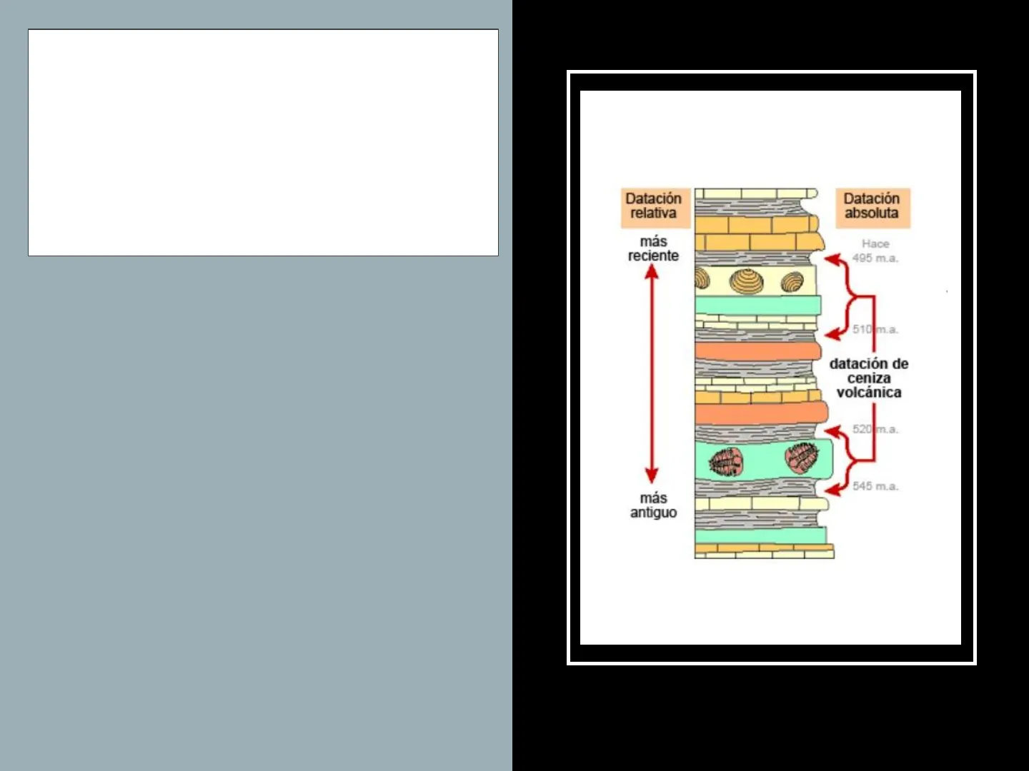 Datación relativa Datación absoluta más reciente Hace 495 m.a. 510 m.a. datación de ceniza volcánica 520 m.a. más antiguo 545 m.a.