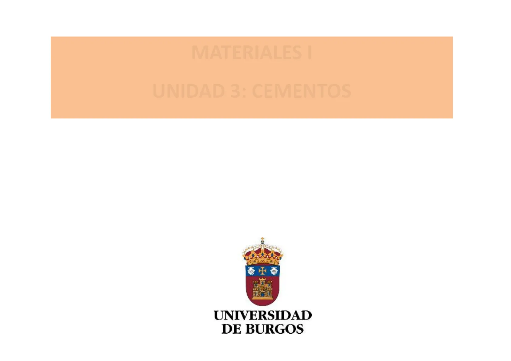 Diapositivas de la Universidad de Burgos sobre Materiales Unidad 3: Cementos. El Pdf explora la introducción, componentes principales como el clinker de portland y adiciones, el proceso de fabricación y la hidratación, distinguiendo entre fraguado y endurecimiento. Este material de Informática de nivel universitario es ideal para comprender los tipos de cementos.