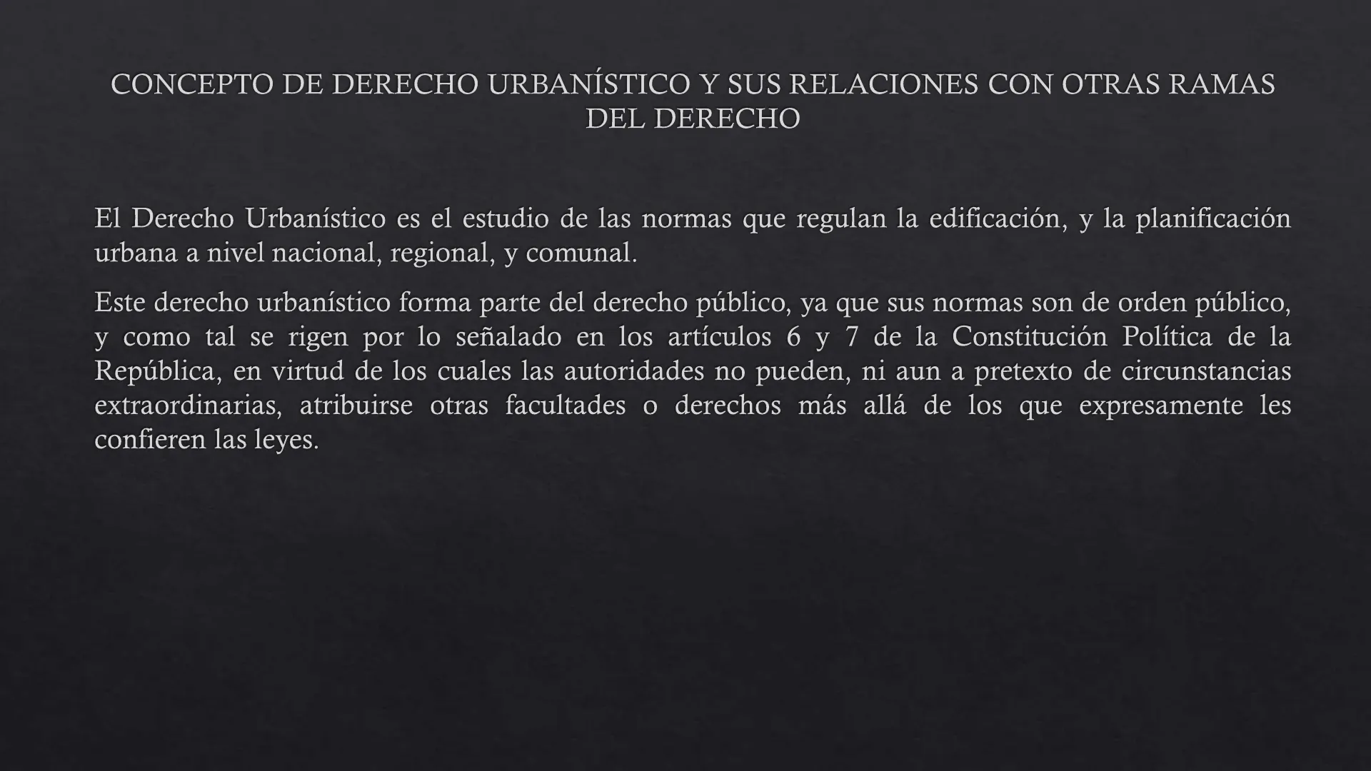 Este derecho urbanístico forma parte del derecho público, ya que sus normas son de orden público, y como tal se rigen por lo señalado en los artículos 6 y 7 de la Constitución Política de la República, en virtud de los cuales las autoridades no pueden, ni aun a pretexto de circunstancias extraordinarias, atribuirse otras facultades o derechos más allá de los que expresamente les confieren las leyes.Además, tiene relaciones con el Derecho Administrativo, cuya columna vertebral es la Ley Orgánica Constitucional sobre Bases Generales de la Administración del Estado (LOCBGAE) y su Ley de Procedimientos.