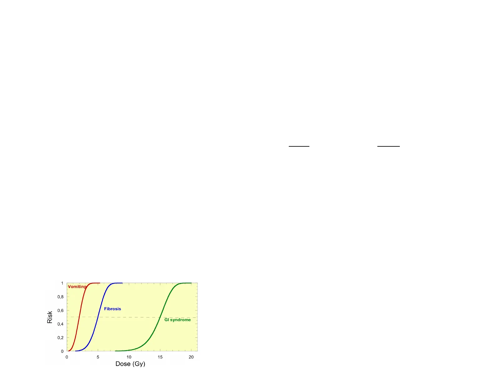 1 Vomiting 0,8 Fibrosis 0,6 Risk GI syndrome 0,4 0,2 0 0 5 10 15 20 Dose (Gy) Per esempio, nel caso della fibrosi polmonare, la D50 può essere circa 5 Gy, mentre per effetti più gravi, come la polmonite, la D50 potrebbe spostarsi verso dosi più alte, attorno ai 10 Gy.Il grafico a sinistra rappresenta un esempio di effetti radioindotti all'intestino: vomito e fibrosi a dosi più basse e sindrome gastrointestinale e potenzialmente letale a dosi più alte. Il modelling degli effetti deterministici è un modelling piuttosto empirico che associare il rischio a una funzione variabile (Weibull function).