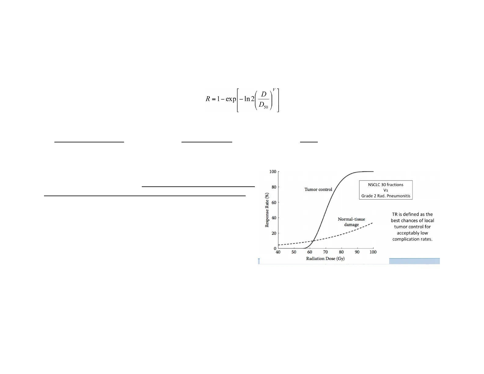 100 NSCLC 30 fractions 80 Tumor control Vs Response Rate (%) Grade 2 Rad. Pneumonitis 60 40 Normal-tissue damage 20 TR is defined as the best chances of local tumor control for acceptably low complication rates. 0 40 50 60 70 80 90 100 Radiation Dose (Gy)
