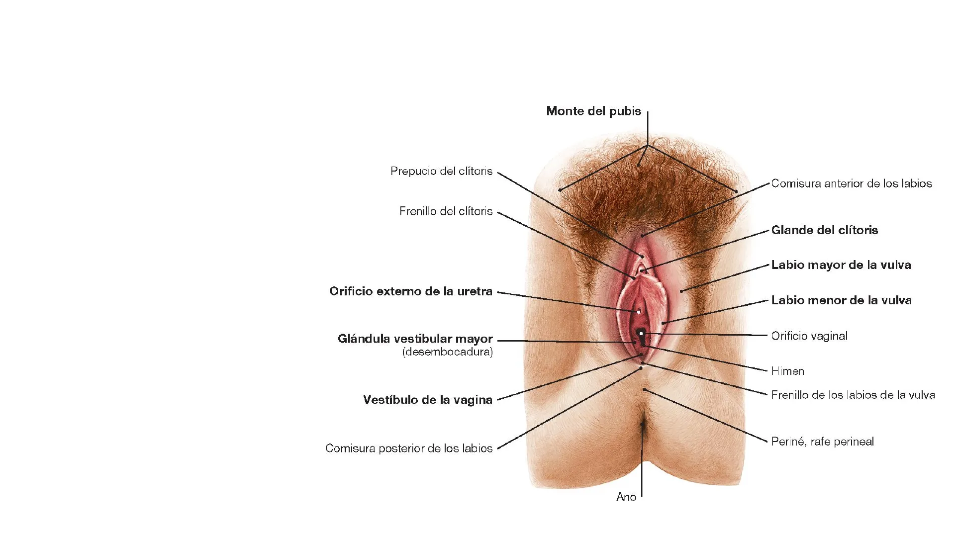 Órganos genitales externos femeninos; visión inferior de la cavidad pelvica postero-anterior. Los labios mayores de la vulva, que aquí contienen el tejido eréctil del bulbo del vestíbulo. Entre estos se encuentran los labios menores de la vulva que rodean el vestíbulo de la vagina, en el que desembocan lateralmente las glándulas vestibulares