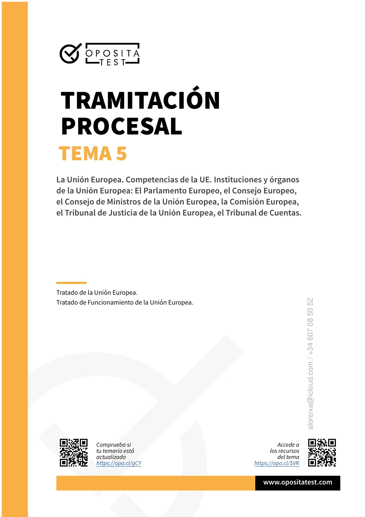 OPOSITA LTEST TRAMITACIÓN PROCESAL TEMA 5 aloreixa@icloud.com / +34 607 08 50 52 www.opositatest.comOPOSITA LTEST TRAMITACIÓN PROCESAL TEMA 5 La Unión Europea. Competencias de la UE. Instituciones y órganos de la Unión Europea: El Parlamento Europeo, el Consejo Europeo, el Consejo de Ministros de la Unión Europea, la Comisión Europea, el Tribunal de Justicia de la Unión Europea, el Tribunal de Cuentas. Tratado de la Unión Europea. Tratado de Funcionamiento de la Unión Europea. aloreixa@icloud.com / +34 607 08 50 52 Comprueba si tu temario está actualizado https://opo.cl/gCY Accede a los recursos del tema https://opo.cl/SVK www.opositatest.comTRAMITACIÓN PROCESAL | TEMA 5