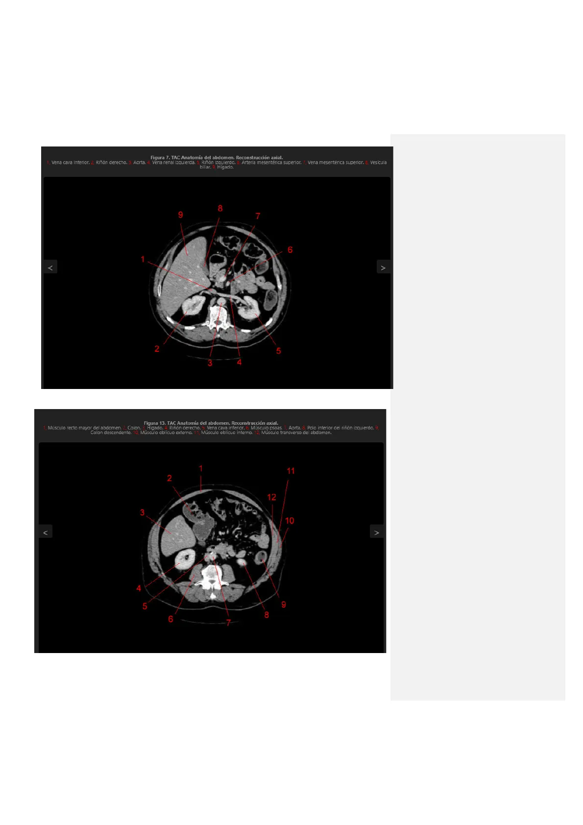 Figura 7. TAC Anatomía del abdomen. Reconstrucción axial. 1, Vena cava inferior. 2, Riñón derecho. 3, Aorta, 4, Vena renal izquierda. 5, Riñón izquierdo. 6, Arteria mesentérica superior. 7, Vena mesentérica superior. 8, Vesícula biliar. 9, Hígado. 8 9 7 6 1 ‹ > 2 5 3 4 En la realidad esta al contrario. Figura 13. TAC Anatomía del abdomen. Reconstrucción axial. 1, Músculo recto mayor del abdomen. 2, Colon. 3, Hígado. 4, Riñón derecho. 5, Vena cava inferior. 6, Músculo psoas. 7, Aorta. 8, Polo inferior del riñón izquierdo. 9, Colon descendente. 10, Musculo oblicuo externo. 11, Musculo oblicuo interno. 12, Músculo transverso del abdomen. 1 11 2 12 3 10 V > 4 9 5 8 6 7