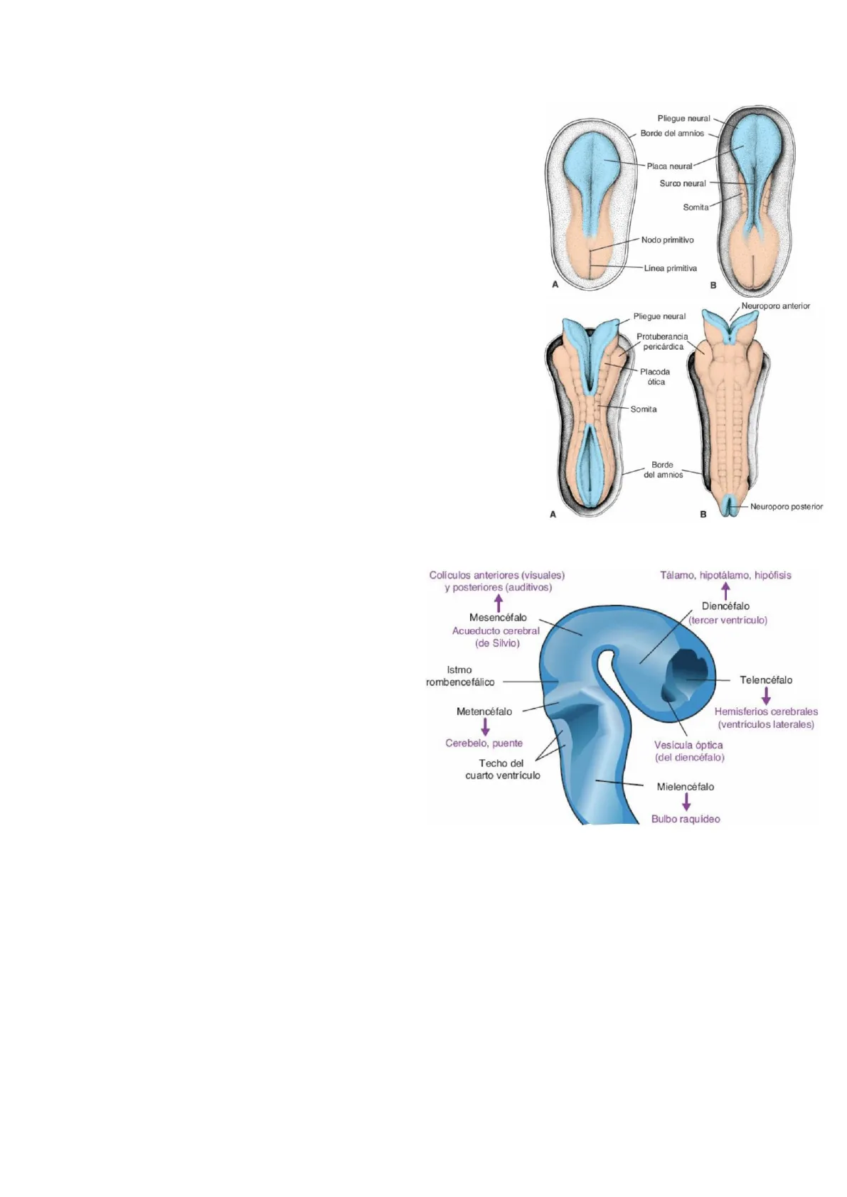 Pliegue neural Borde del amnios Placa neural Surco neural Somita Nodo primitivo Línea primitiva A B Neuroporo anterior Pliegue neural Protuberancia pericárdica Placoda ótica Somita Borde del amnios Neuroporo posterior A B