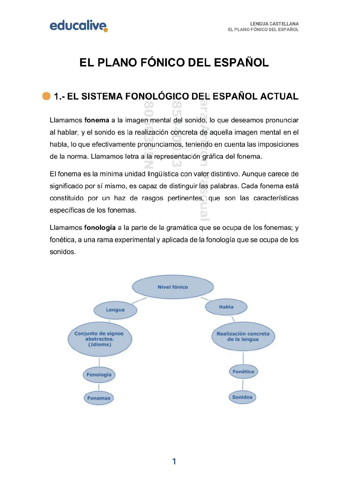 educalive® LENGUA CASTELLANA EL PLANO FÓNICO DEL ESPAÑOL EL PLANO FÓNICO DEL ESPAÑOL 1 .- EL SISTEMA FONOLÓGICO DEL ESPAÑOL ACTUAL . Llamamos fonema a la imagen mental del sonido, lo que deseamos pronunciar al hablar, y el sonido es la realización concreta de aquella imagen mental en el habla, lo que efectivamente pronunciamos, teniendo en cuenta las imposiciones de la norma. Llamamos letra a la representación gráfica del fonema.