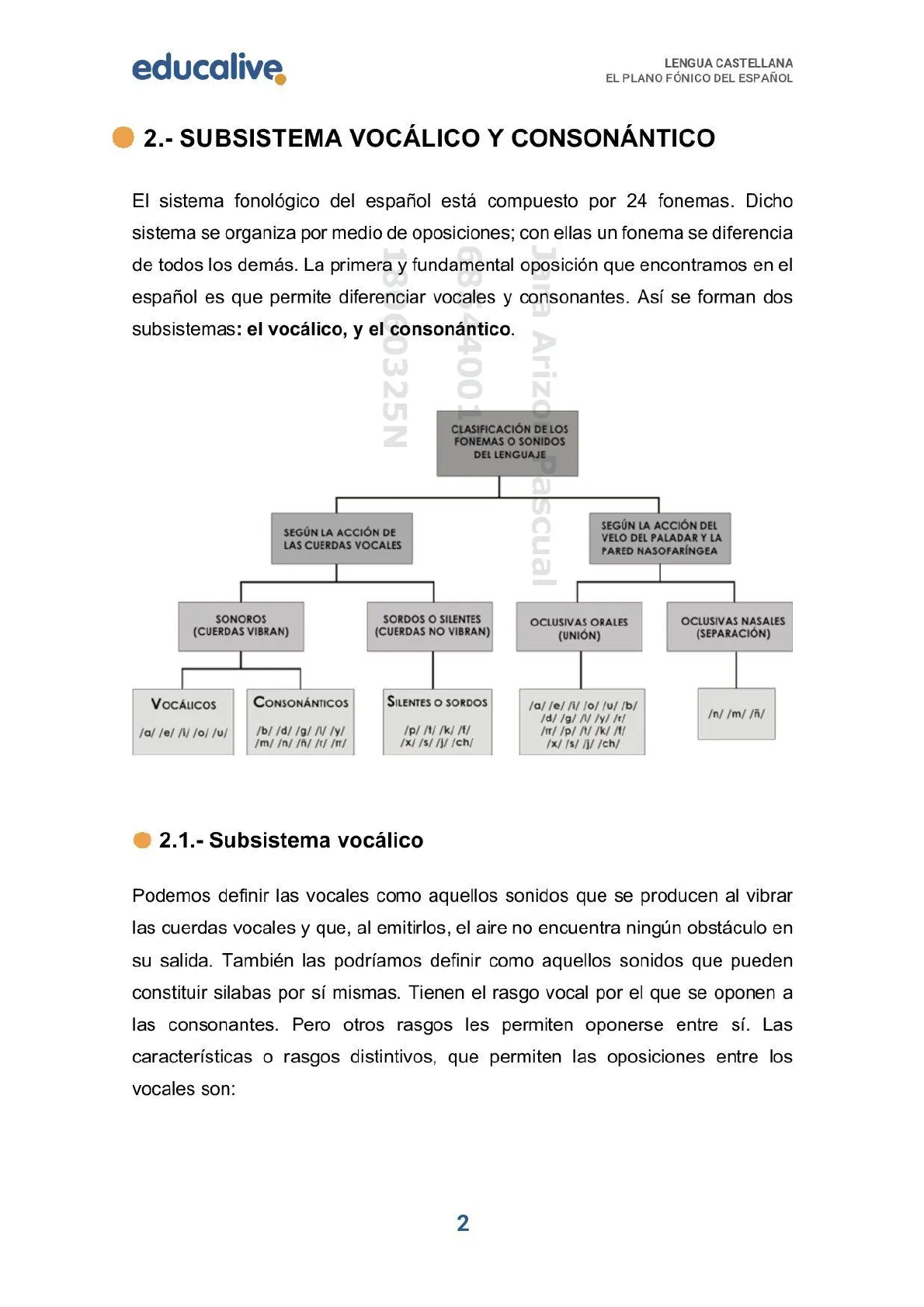80325N $1001 Arizo CLASIFICACIÓN DE LOS FONEMAS O SONIDOS DEL LENGUAJE , ascual SEGÚN LA ACCIÓN DE LAS CUERDAS VOCALES SEGÚN LA ACCIÓN DEL VELO DEL PALADAR Y LA PARED NASOFARÍNGEA SONOROS (CUERDAS VIBRAN) SORDOS O SILENTES (CUERDAS NO VIBRAN) OCLUSIVAS ORALES (UNIÓN) OCLUSIVAS NASALES (SEPARACIÓN) VOCÁLICOS /a/ /e//i//o//u/ CONSONÁNTICOS SILENTES O SORDOS /n/ /m/ /ñ/ /b/ /d/ /g/ /\/ /y/ /m/ /n/ /n/ /t/ /T/ /p//t/ /k/ /t/ /x/ /s//j//ch/ /a/ /e//i//o//u//b/ /d/ /g/ /\//y/ /t/ /fr/ /p/ /t/ /k/ /t/ /x/ /s/ /j//ch/