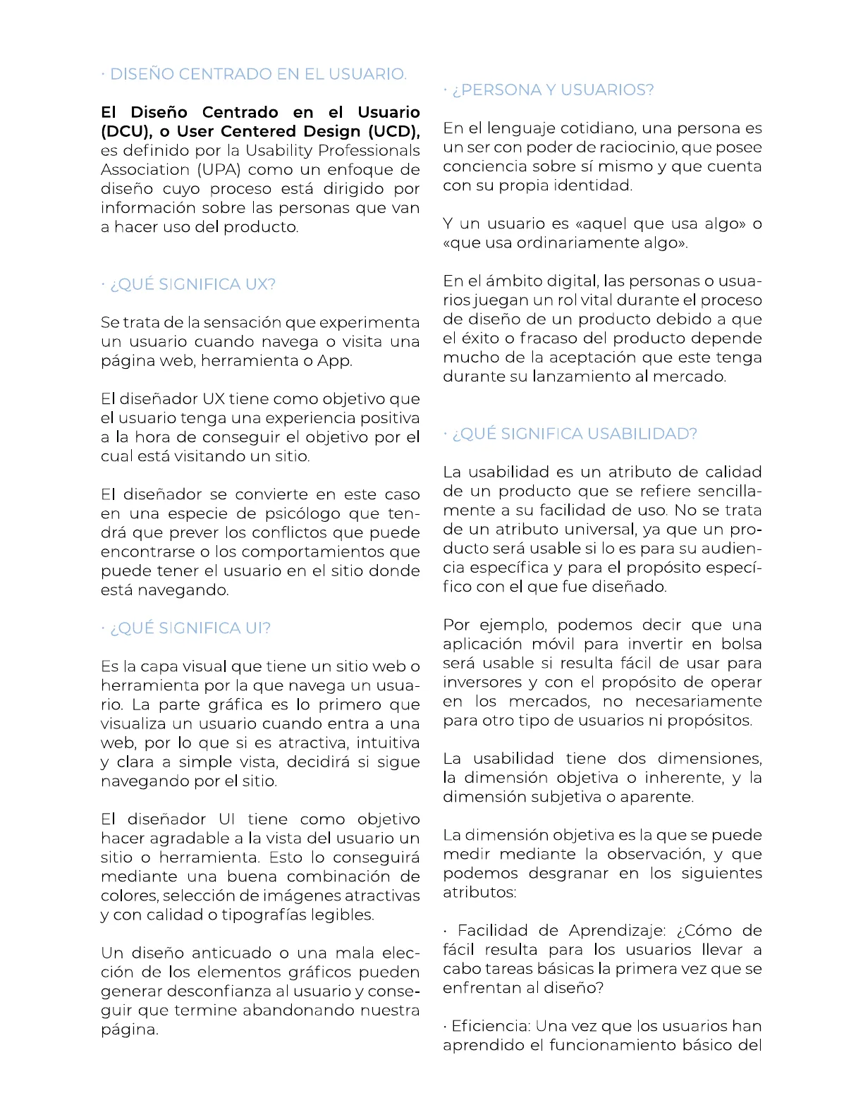 Es precisamente la experiencia usando un producto, cómo este es capaz de resolver nuestras necesidades y objetivos de forma eficiente y fluida, la que deter- minará su aceptación social y su diferen- ciación entre competidores.· DISEÑO CENTRADO EN EL USUARIO.