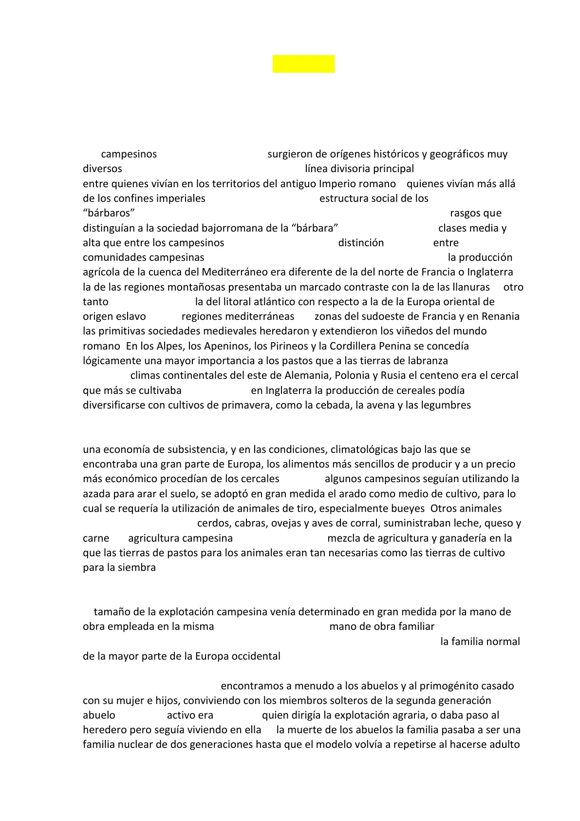 Los campesinos de la Europa medieval surgieron de orígenes históricos y geográficos muy diversos. A primera vista podría creerse que la línea divisoria principal sería la existente entre quienes vivían en los territorios del antiguo Imperio romano y quienes vivían más allá de los confines imperiales. Pero ya en el siglo V la estructura social de los llamados "bárbaros" se estaba volviendo muy similar a la del moribundo Imperio, y los rasgos que distinguían a la sociedad bajorromana de la "bárbara" se daban más en las clases media y alta que entre los campesinos. Más importante era la distinción existente entre comunidades campesinas que vivían bajo condiciones naturales diferentes2: la producción agrícola de la cuenca del Mediterráneo era diferente de la del norte de Francia o Inglaterra, la de las regiones montañosas presentaba un marcado contraste con la de las llanuras, y otro tanto puede decirse de la del litoral atlántico con respecto a la de la Europa oriental de origen eslavo. En las regiones mediterráneas, en zonas del sudoeste de Francia y en Renania, las primitivas sociedades medievales heredaron y extendieron los viñedos del mundo romano. En los Alpes, los Apeninos, los Pirineos y la Cordillera Penina se concedía lógicamente una mayor importancia a los pastos que a las tierras de labranza. En los extremos climas continentales del este de Alemania, Polonia y Rusia el centeno era el cercal que más se cultivaba, en tanto que en Inglaterra la producción de cereales podía diversificarse con cultivos de primavera, como la cebada, la avena y las legumbres.