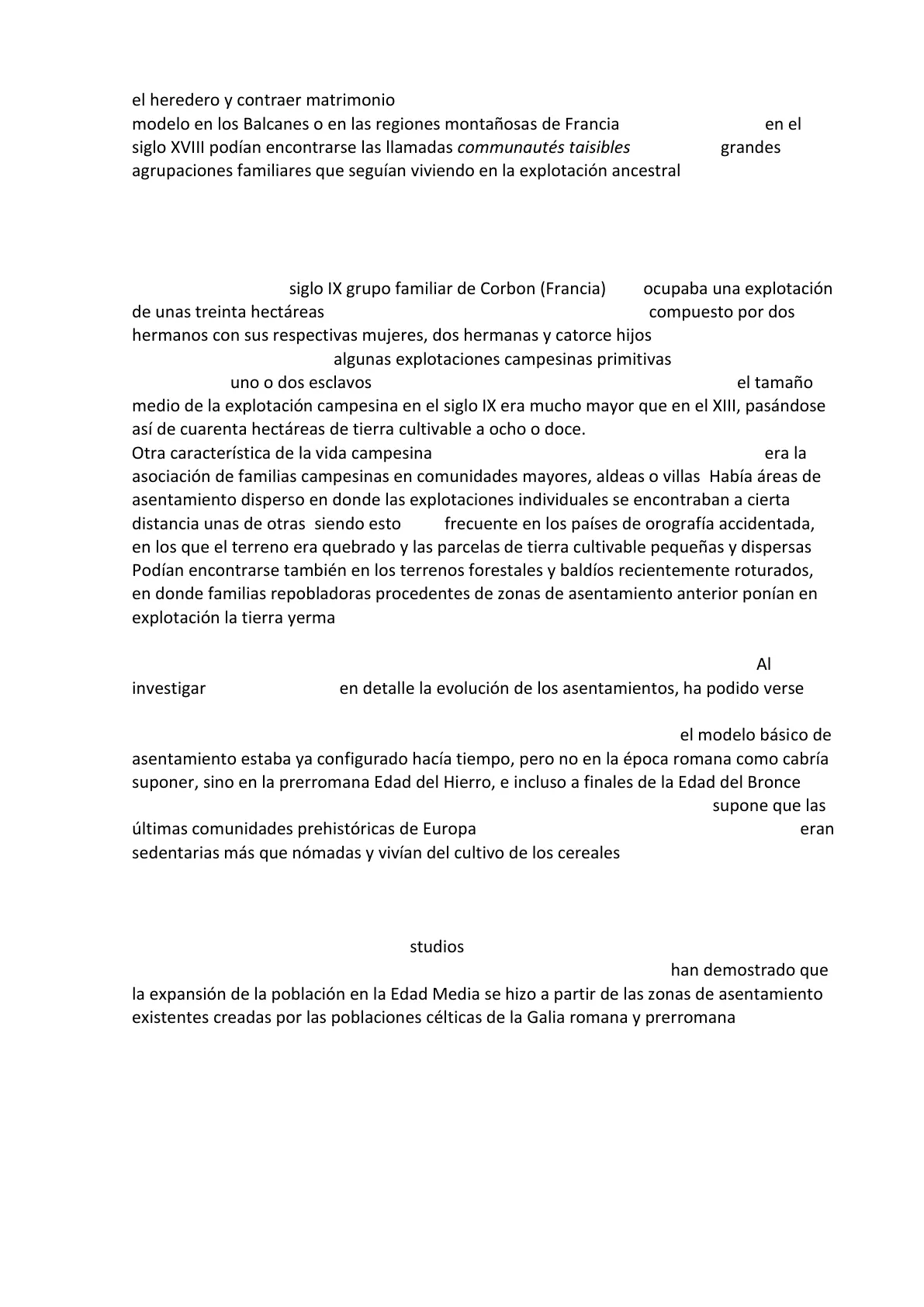 Otra característica de la vida campesina común a la mayoría de los países europeos era la asociación de familias campesinas en comunidades mayores, aldeas o villas. Había áreas de asentamiento disperso en donde las explotaciones individuales se encontraban a cierta distancia unas de otras, siendo esto nota frecuente en los países de orografía accidentada, en los que el terreno era quebrado y las parcelas de tierra cultivable pequeñas y dispersas. Podían encontrarse también en los terrenos forestales y baldíos recientemente roturados, en donde familias repobladoras procedentes de zonas de asentamiento anterior ponían en explotación la tierra yerma, o incluso en los espacios comprendidos entre antiguos asentamientos de tipo nuclear. Pero la norma era la vida en comunidades con una organización precisa, remontándose a varios siglos las bases de esta convivencia7. Al investigar los historiadores en detalle la evolución de los asentamientos, ha podido verse con mayor claridad que, a pesar de los pobladores de nueva planta creadas durante el período de expansión demográfica comprendido entre los siglos XI y XII, el modelo básico de asentamiento estaba ya configurado hacía tiempo, pero no en la época romana como cabría suponer, sino en la prerromana Edad del Hierro, e incluso a finales de la Edad del Bronce. Tal afirmación ha podido documentarse sobre una base arqueológica. La misma supone que las últimas comunidades prehistóricas de Europa, a pesar de ser de dimensiones reducidas, eran sedentarias más que nómadas y vivían del cultivo de los cereales, al tiempo que, apacentaban los rebaños y recogían los frutos de las extensas regiones de bosques.