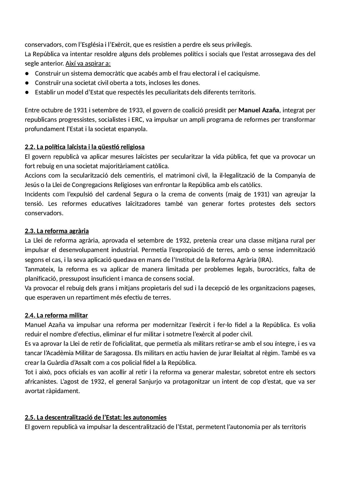 Entre octubre de 1931 i setembre de 1933, el govern de coalició presidit per Manuel Azaña, integrat per republicans progressistes, socialistes i ERC, va impulsar un ampli programa de reformes per transformar profundament l'Estat i la societat espanyola.