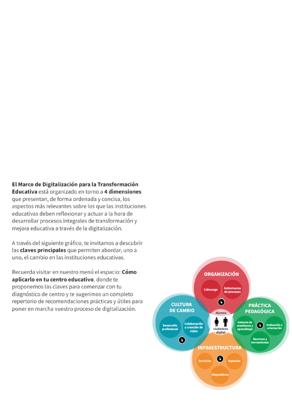A través del siguiente gráfico, te invitamos a descubrir las claves principales que permiten abordar, uno a uno, el cambio en las instituciones educativas. Recuerda visitar en nuestro menú el espacio: Cómo aplicarlo en tu centro educativo, donde te proponemos las claves para comenzar con tu diagnóstico de centro y te sugerimos un completo repertorio de recomendaciones prácticas y útiles para poner en marcha vuestro proceso de digitalización.