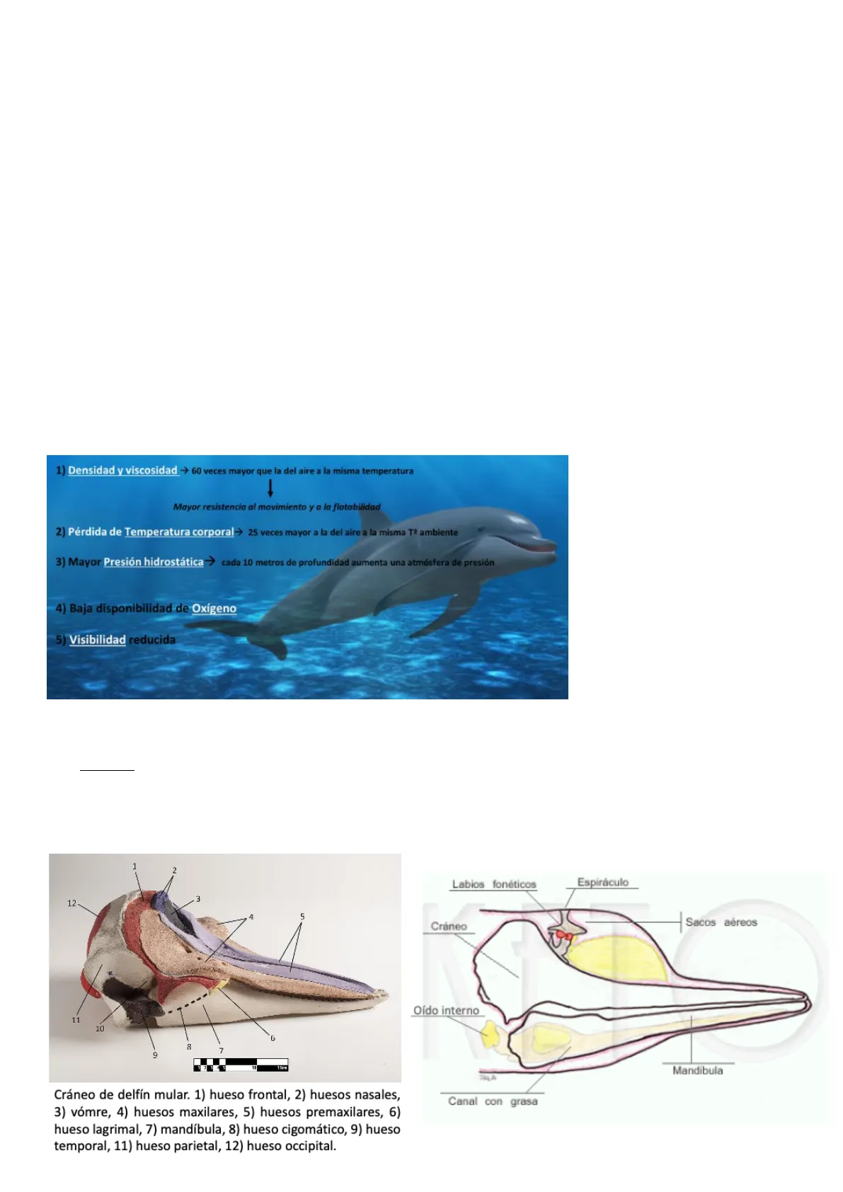 Diapositivas sobre Anatomía de los Delfínidos. El Pdf detalla la clasificación, adaptación al medio marino y sistemas corporales de los delfínidos, incluyendo esqueleto, aparatos circulatorio, digestivo, urinario y reproductor, con foco en la termorregulación. Este material de Biología para Universidad, con numerosas ilustraciones, es útil para el estudio autónomo.