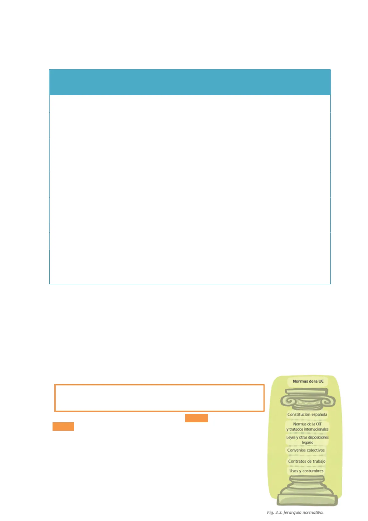 Las normas se ordenan de manera jerárquica de mayor a menor rango (principio de jerarquía), en orden descendente. Las de mayor rango prevalecen sobre las de menor rango, y las de menor rango no Normas de la UE Constitución española Normas de la OIT y tratados internacionales Leyes y otras disposiciones legales Convenios colectivos Contratos de trabajo Usos y costumbres Fig. 3.3. Jerarquía normativa.OARH