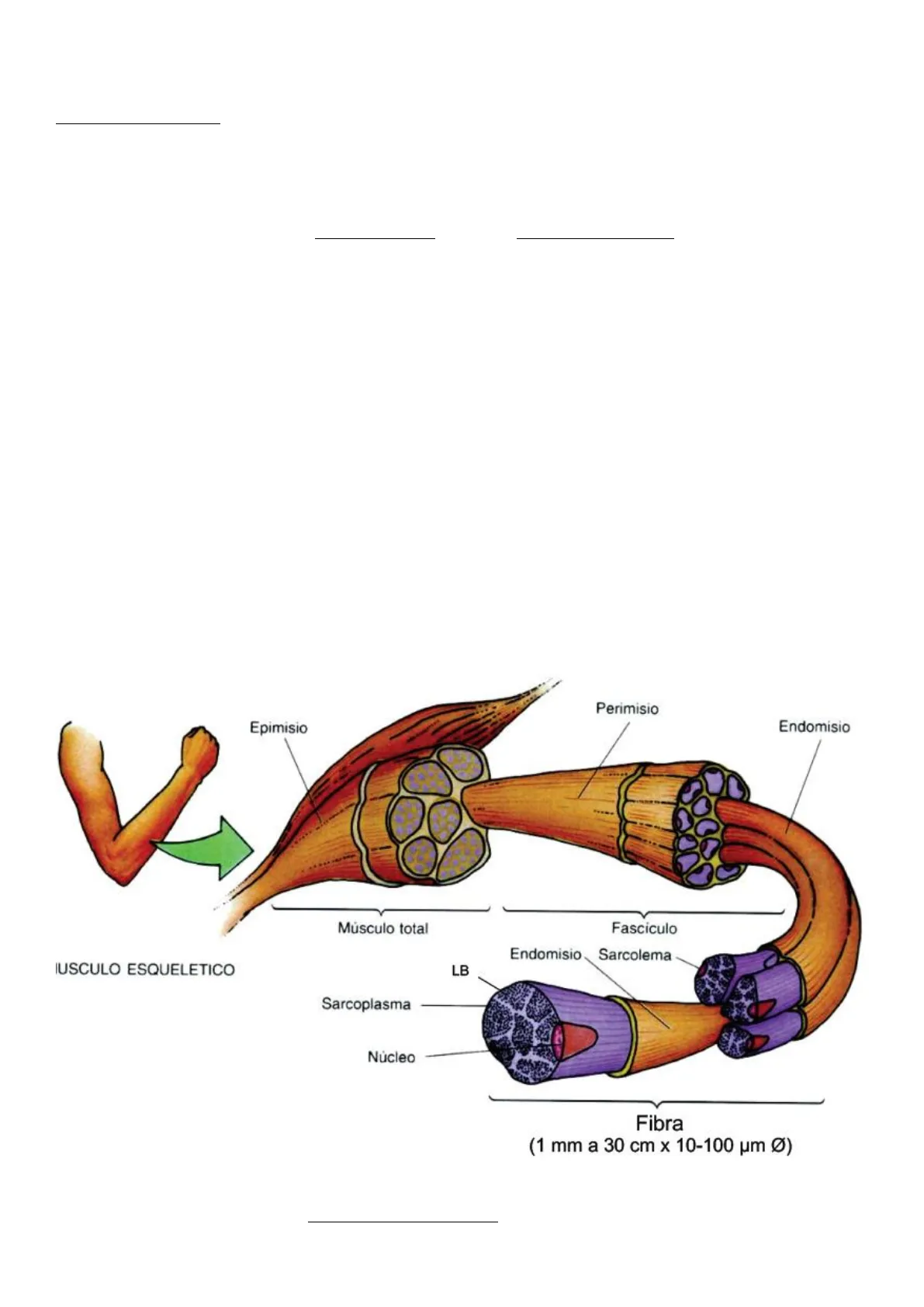 V Perimisio Epimisio Endomisio Músculo total Fasciculo Endomisio Sarcolema IUSCULO ESQUELETICO LB Sarcoplasma Núcleo Fibra (1 mm a 30 cm x 10-100 um Ø)