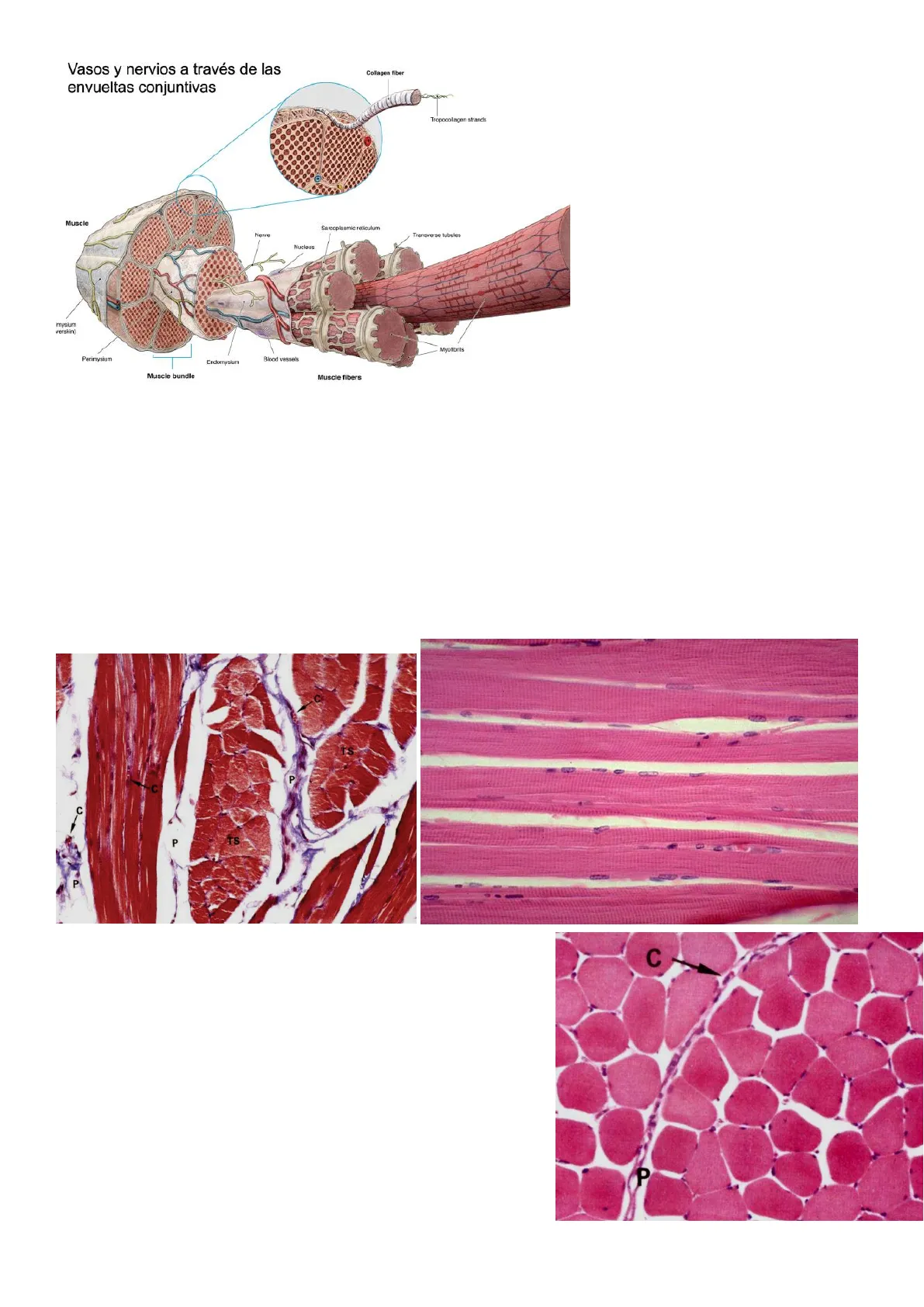 Imagen izquierda > Corte de músculo esquelético donde se ven fibras cortadas trasversalmente (TS), rodeadas de perimisio (P), capilares (C). Imagen derecha > se aprecian varias fibras musculares esqueléticas. Es muy característico que presenten un grosor mayor que las lisas y cardiacas. Las fibras musculares son células multinucleadas con núcleos periféricos, aplanados y su citoplasma lleno de elementos con estrías. Las estrías se ven en función de la tinción usada, pero siempre están presentes. Como puede comprobarse es un tejido muy eosinófilo por la gran cantidad de miofilamentos que presenta, por ello se ve muy rosa en una tinción HE.