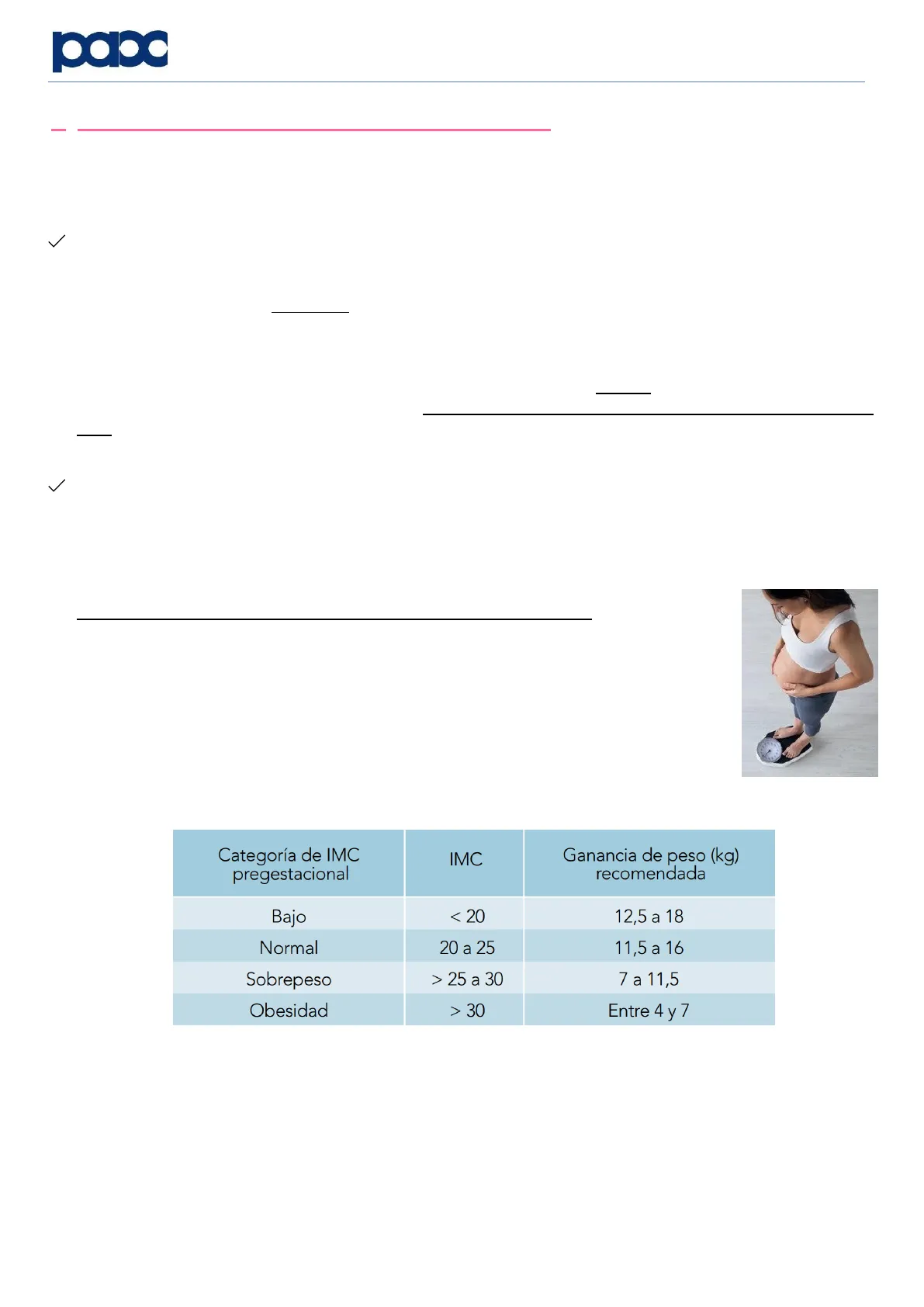 En la tabla siguiente se presentan las ganancias de peso aproximado según el IMC previo de la madre: