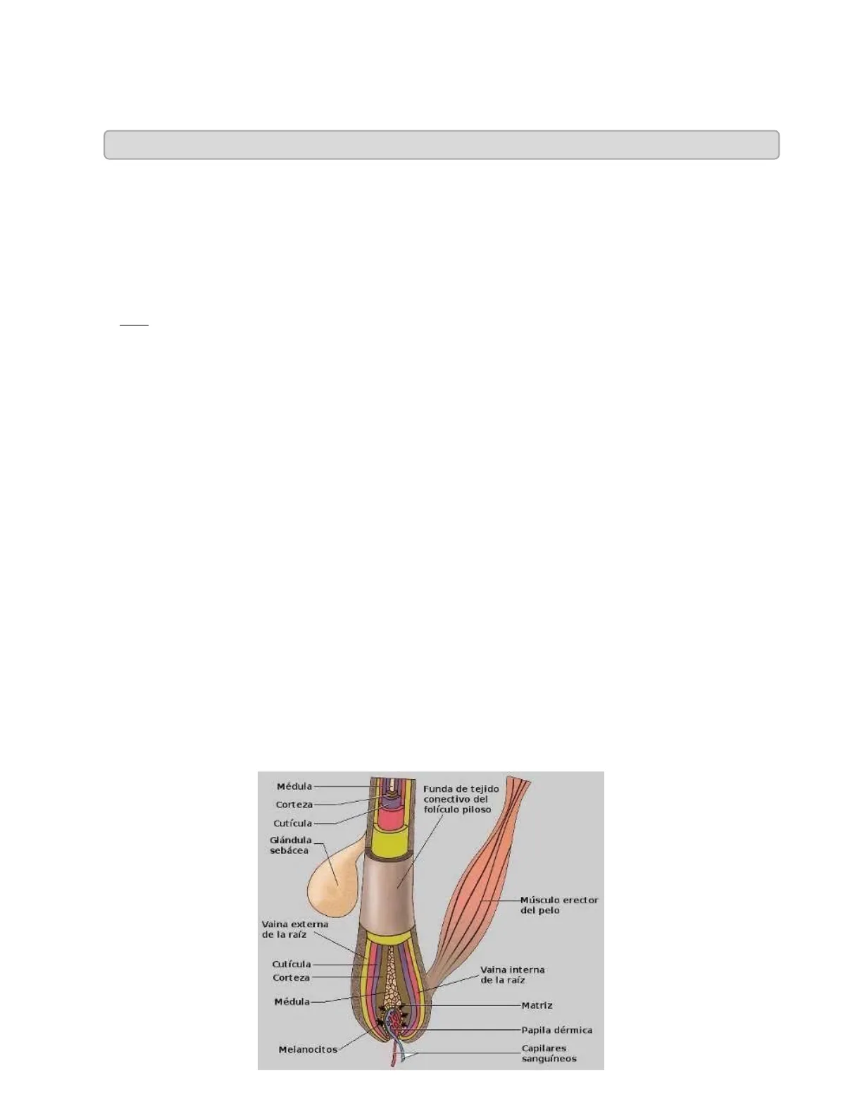 Médula Funda de tejido conectivo del folículo piloso Corteza Cutícula- Glándula sebácea Músculo erector del pelo Vaina externa de la raíz Cutícula Corteza Vaina interna de la raíz Médula Matriz Papila dérmica Melanocitos Capilares sanguíneos