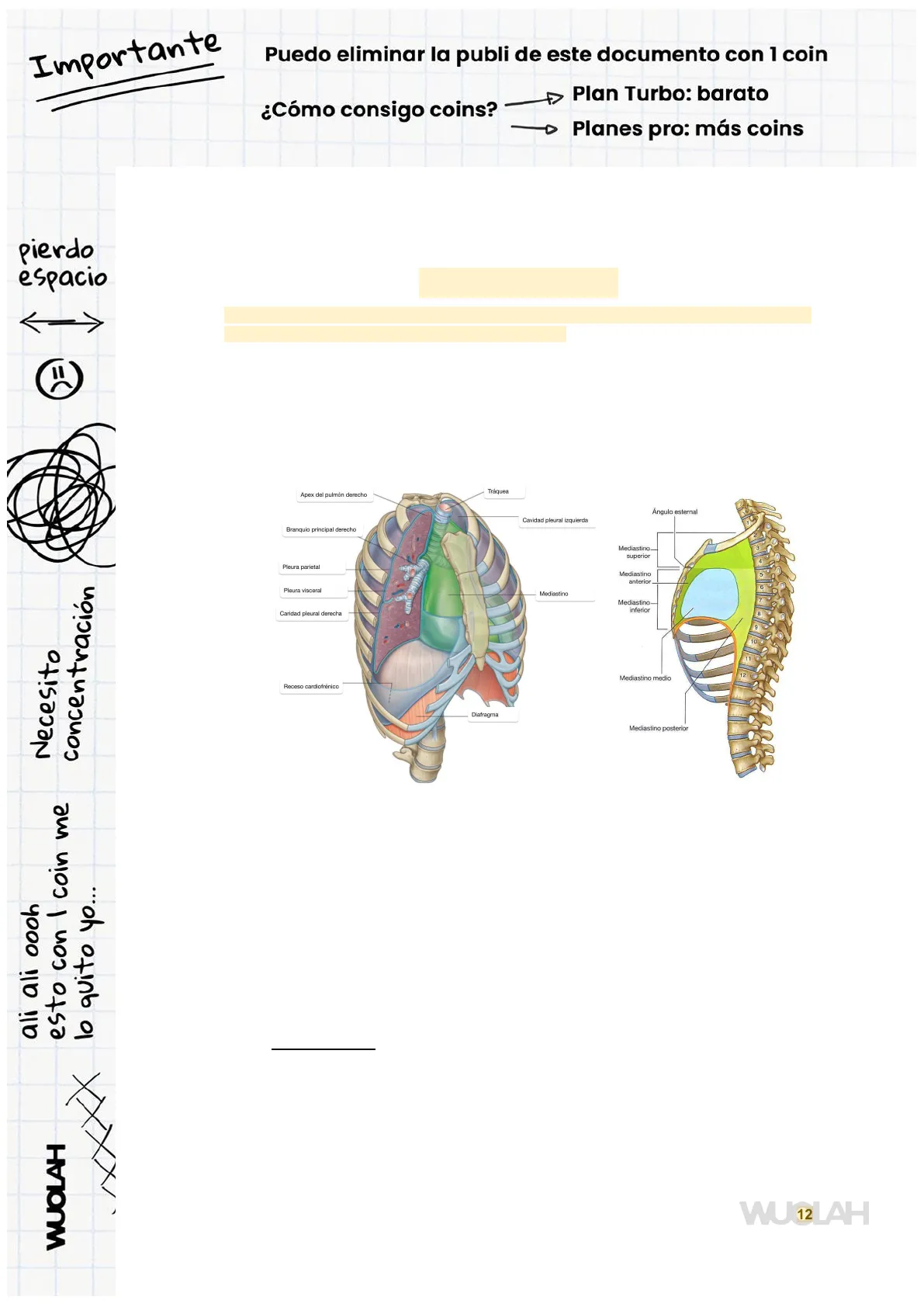 Traquea Esófago Arteria carótida común derecha Arteria carótida común izquierda Right internal jugular vein Left internal jugular vein Arteria subclavia derecha Arteria subclavia izquierda Vena subclavia derecha Vena subclavia izquierda Tronco, braquiocefálico derecho Tronco braquiocefálico izquierdo Cayado de la Aorta Arteria pulmonar derecha Arteria pulmonar izquierda Vena Cava superior Bronquio principal izquierdo Tronco de la arteria pulmonar Aorta torácica Bronquio principal derecho Esófago Aorta ascendente 14 Reservados todos los derechos. No se permite la explotación económica ni la transformación de esta obra. Queda permitida la impresión en su totalidad. WUOLAH 1 coin = 1 pdf sin publicidadImportante Puedo eliminar la publi de este documento con 1 coin Plan Turbo: barato ¿Cómo consigo coins? Planes pro: más coins pierdo espacio Necesito concentración ali ali oooh esto con I coin me lo quito yo ... ALEJANDRO LÓPEZ SUÁREZ