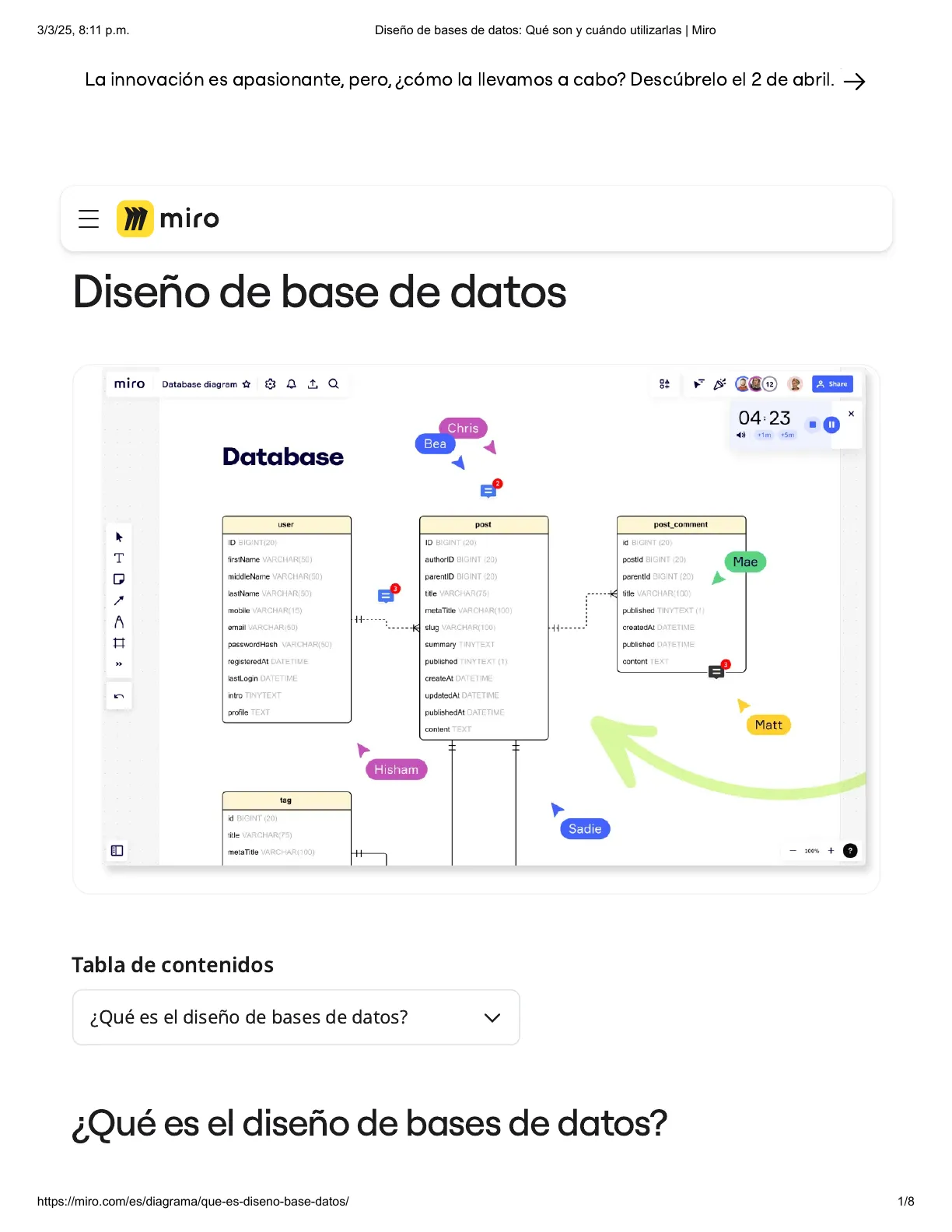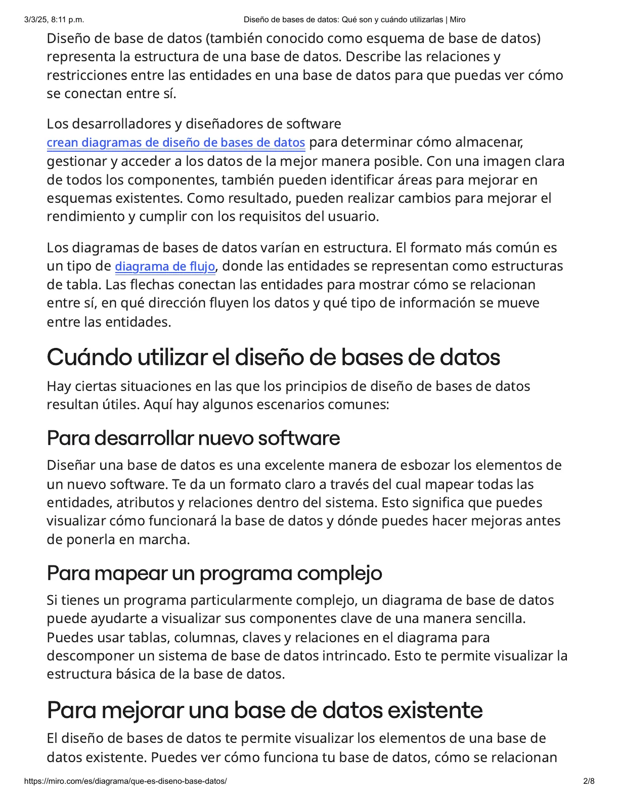 ¿Qué es el diseño de bases de datos? https://miro.com/es/diagrama/que-es-diseno-base-datos/ 1/8 04:23 × +1m +5m AHDICHA 3 = 5 Sadie3/3/25, 8:11 p.m. Diseño de bases de datos: Qué son y cuándo utilizarlas | Miro Diseño de base de datos (también conocido como esquema de base de datos) representa la estructura de una base de datos. Describe las relaciones y restricciones entre las entidades en una base de datos para que puedas ver cómo se conectan entre sí. Los desarrolladores y diseñadores de software crean diagramas de diseño de bases de datos para determinar cómo almacenar, gestionar y acceder a los datos de la mejor manera posible. Con una imagen clara de todos los componentes, también pueden identificar áreas para mejorar en esquemas existentes. Como resultado, pueden realizar cambios para mejorar el rendimiento y cumplir con los requisitos del usuario. Los diagramas de bases de datos varían en estructura. El formato más común es un tipo de diagrama de flujo, donde las entidades se representan como estructuras de tabla. Las flechas conectan las entidades para mostrar cómo se relacionan entre sí, en qué dirección fluyen los datos y qué tipo de información se mueve entre las entidades.