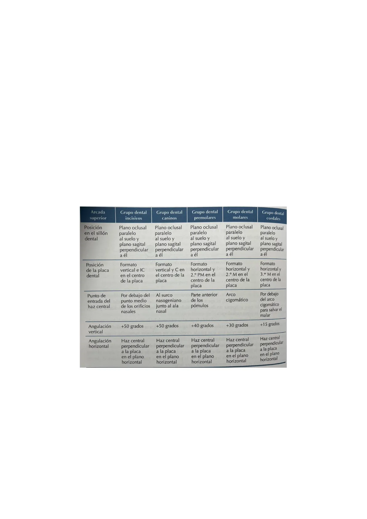 Arcada superior Grupo dental incisivos Grupo dental caninos Grupo dental premolares Grupo dental molares Grupo dental cordales Posición en el sillón dental Plano oclusal paralelo al suelo y plano sagital perpendicular a él Plano oclusal paralelo al suelo y plano sagital perpendicular a él Plano oclusal paralelo al suelo y plano sagital perpendicular a él Plano oclusal paralelo al suelo y plano sagital perpendicular a él Plano oclusal paralelo al suelo y plano sagital perpendicular a él Posición de la placa dental Formato vertical e IC en el centro de la placa Formato vertical y C en el centro de la placa Formato horizontal y 2.º PM en el centro de la placa Formato horizontal y 2.º M en el centro de la placa Formato horizontal y 3.er M en el centro de la placa Punto de entrada del haz central Por debajo del punto medio de los orificios nasales Al surco nasogeniano junto al ala nasal Parte anterior de los pómulos Arco cigomático Por debajo del arco cigomático para salvar el malar Angulación vertical +50 grados +50 grados +40 grados +30 grados +15 grados Angulación horizontal Haz central perpendicular Haz central Haz central perpendicular a la placa en el plano horizontal Haz central perpendicular a la placa perpendicular a la placa a la placa en el plano en el plano horizontal horizontal perpendicular a la placa en el plano horizontal