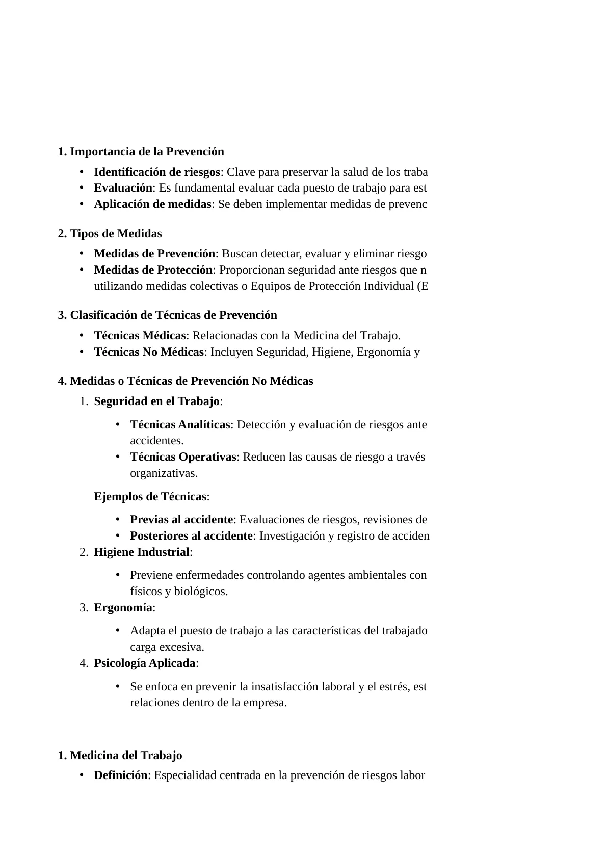1. Seguridad en el Trabajo: · Técnicas Analíticas: Detección y evaluación de riesgos antes y después de accidentes. · Técnicas Operativas: Reducen las causas de riesgo a través de acciones técnicas y organizativas. Ejemplos de Técnicas: · Previas al accidente: Evaluaciones de riesgos, revisiones de seguridad. · Posteriores al accidente: Investigación y registro de accidentes.