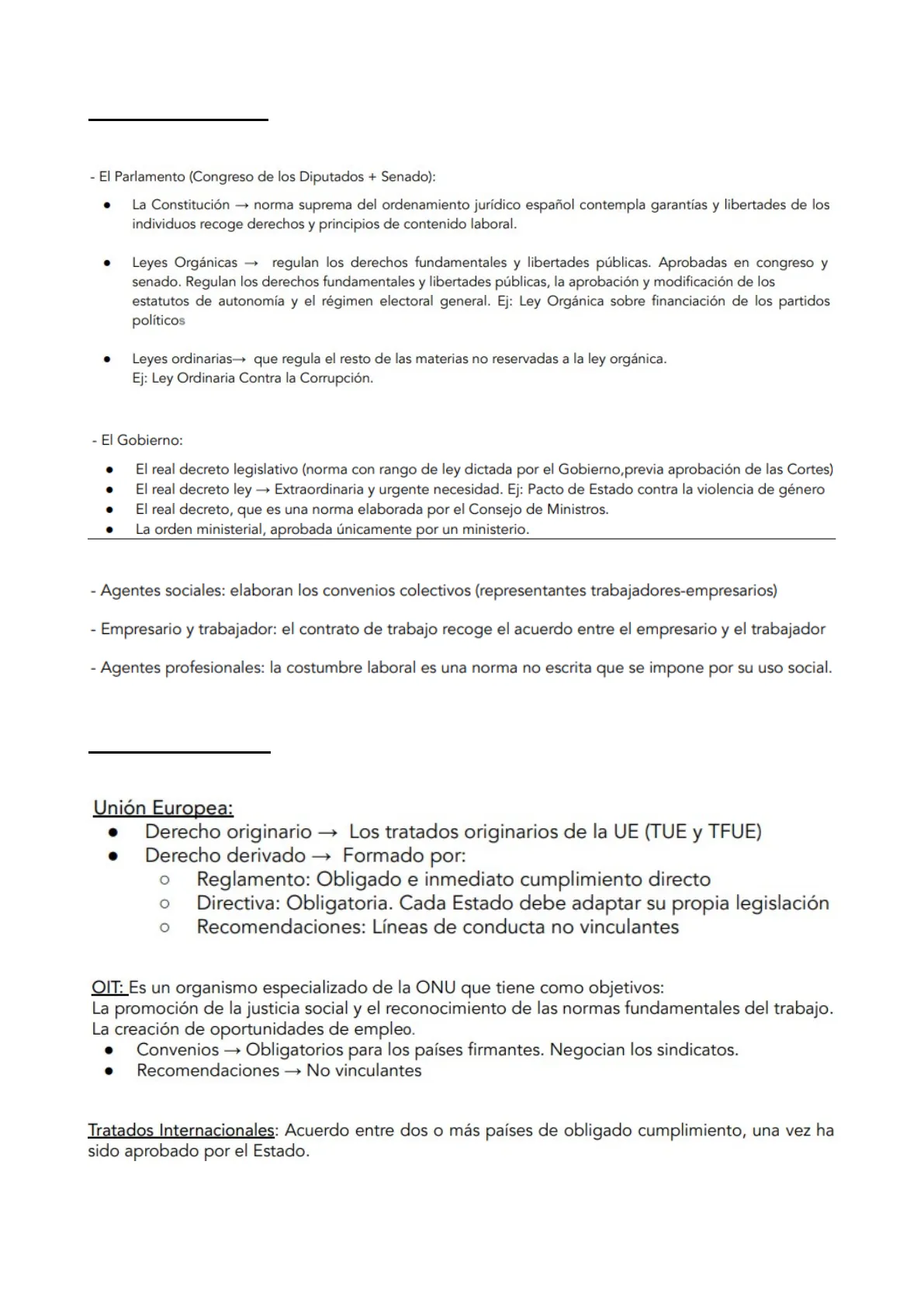 - El Parlamento (Congreso de los Diputados + Senado): · La Constitución -> norma suprema del ordenamiento jurídico español contempla garantías y libertades de los individuos recoge derechos y principios de contenido laboral. · Leyes Orgánicas - regulan los derechos fundamentales y libertades públicas. Aprobadas en congreso y senado. Regulan los derechos fundamentales y libertades públicas, la aprobación y modificación de los estatutos de autonomía y el régimen electoral general. Ej: Ley Orgánica sobre financiación de los partidos políticos · Leyes ordinarias-> que regula el resto de las materias no reservadas a la ley orgánica. Ej: Ley Ordinaria Contra la Corrupción.