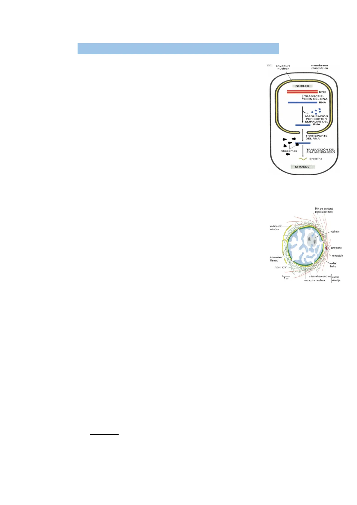 El núcleo en las células eucariotas es una estructura sumamente importante ya que es el centro de control genético. En él tenemos el ADN en forma de cromatina y se condensa durante la división celular y hay que protegerlo con una estructura llamada envoltura nuclear. Debido a la diferenciación celular existen: células anucleadas (glóbulos rojos), bi o plurinucleadas (músculo esquelético.