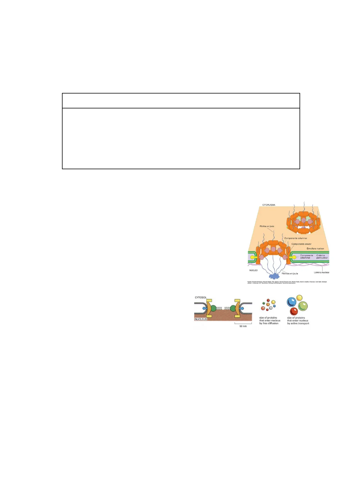 CITOPLASMA Fibrillas en jaula Componente columnar Componente anular Envoltura nuclear Componente adluminal Cisterna perinuclear Fibrillas en jaula Lámina nuclear Fuente: Ricardo Paniagua, Manual Nistal, Pilar Sesma, Manuel Álvarez-Uria, Benito Fraile, Ramón Anadón, Francisco José Sada: Biologia celular y molecular, 4e. Derechos @ McGraw-Hil Education, Derechos Reservados. Es una estructura formada por un conjunto proteico como si tuviera 2 compuertas. Este complejo proteico tiene una NÚCLEO zona que no tiene proteínas donde solo pasan las moléculas pequeñas que tienen menos de 60 KD y difunden y pasan por esta pequeña CYTOSOL compuerta pero lo demás no pasa. Para que todo lo demás pase necesitan NUCLEUS size of proteins that enter nucleus 50 nm by free diffusion energía ATP o GTP. Todas las proteínas que van al núcleo tienen una secuencia de aminoácidos o un péptido señal que me va a indicar que esta proteína es del núcleo (NSL: size of proteins that enter nucleus by active transport pro,lys,lys,arg,lys,val). Péptido señal que cuando se termina de sintetizar esa proteína en el citosol me indica que esa proteína va a ir al núcleo pasando por el poro nuclear necesitando consumo de energía como ATP o GTP (si es mayor a 60 kD).b. TRANSPORTE ENTRE EL NÚCLEO Y CITOPLASMA
