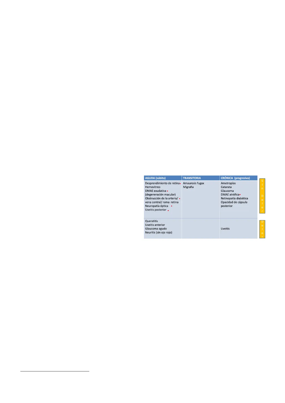 Como vemos en la tabla, podemos dividir la disminución de agudeza visual en función de su forma de aparición: aguda, transitoria y crónica. Generalmente las causas que nos interesa identificar son las agudas, pues estas suelen ser más graves que las crónicas. Además, resulta importante la rápida identificación porque haciendo un buen tratamiento de las causas agudas, podemos mejorar el pronóstico visual. Cabe destacar que cuando hablamos de causas agudas, hablamos de causas que se manifiesta des de hace máximo 2 semanas. Como detalle hay que decir que las causas agudas con dolor, generalmente, se van a acompañar de ojo rojo, a excepción de las neuritis.