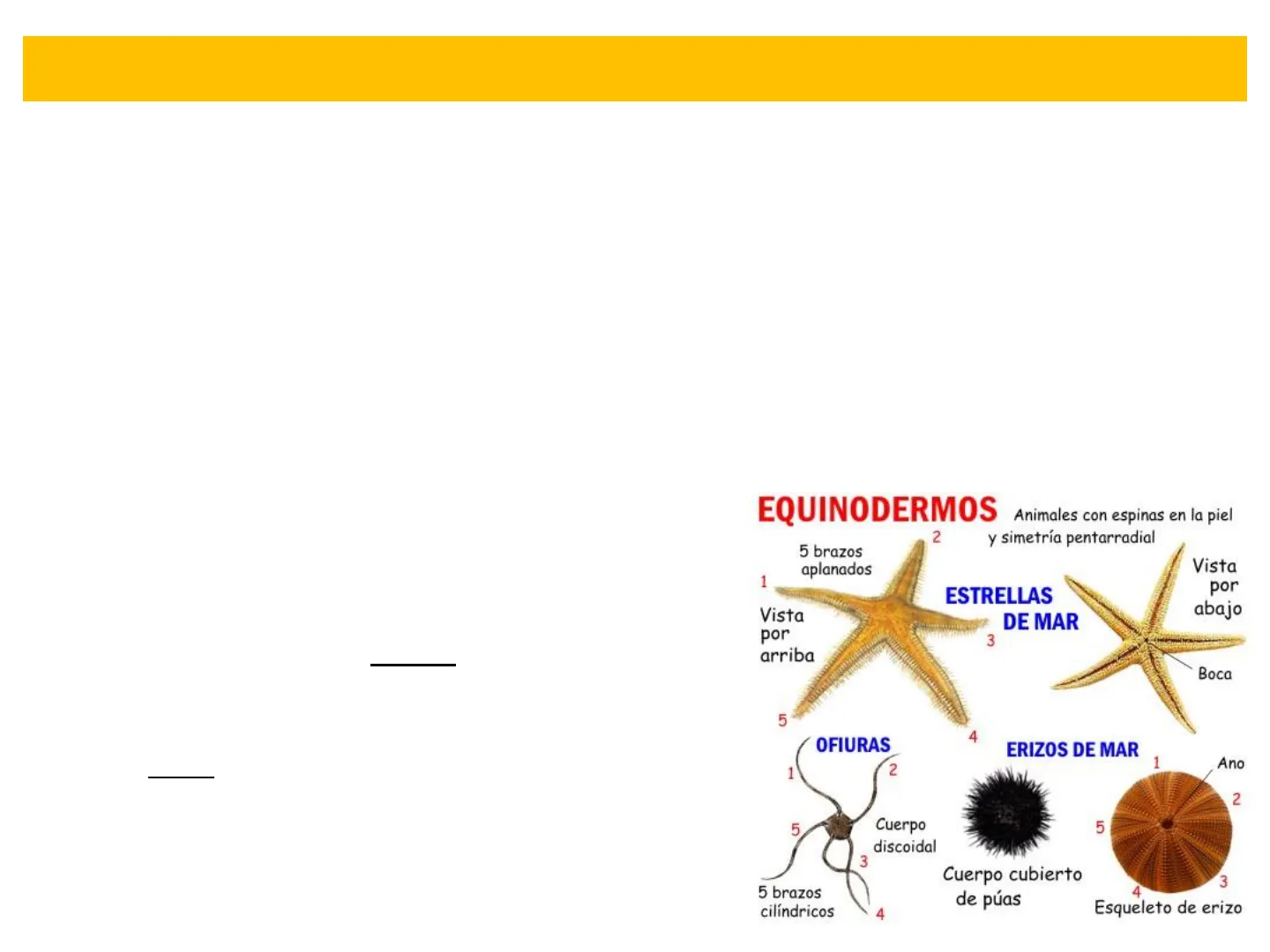 Diapositivas sobre Los Equinodermos. El Pdf detalla la organización, hábitat y simetría de los equinodermos, con un enfoque en asteroideos, ofiuroideos y equinoideos. Este material de Biología para Bachillerato, con texto conciso e imágenes, es ideal para el estudio autónomo.