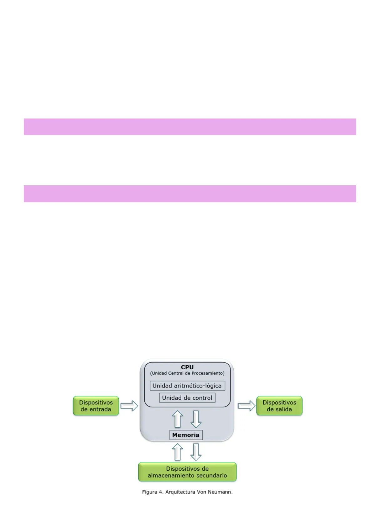 CPU (Unidad Central de Procesamiento) Unidad aritmético-lógica Unidad de control Dispositivos de entrada Dispositivos de salida Memoria Dispositivos de almacenamiento secundario Figura 4. Arquitectura Von Neumann.Pueden agruparse en cinco grandes categorías: