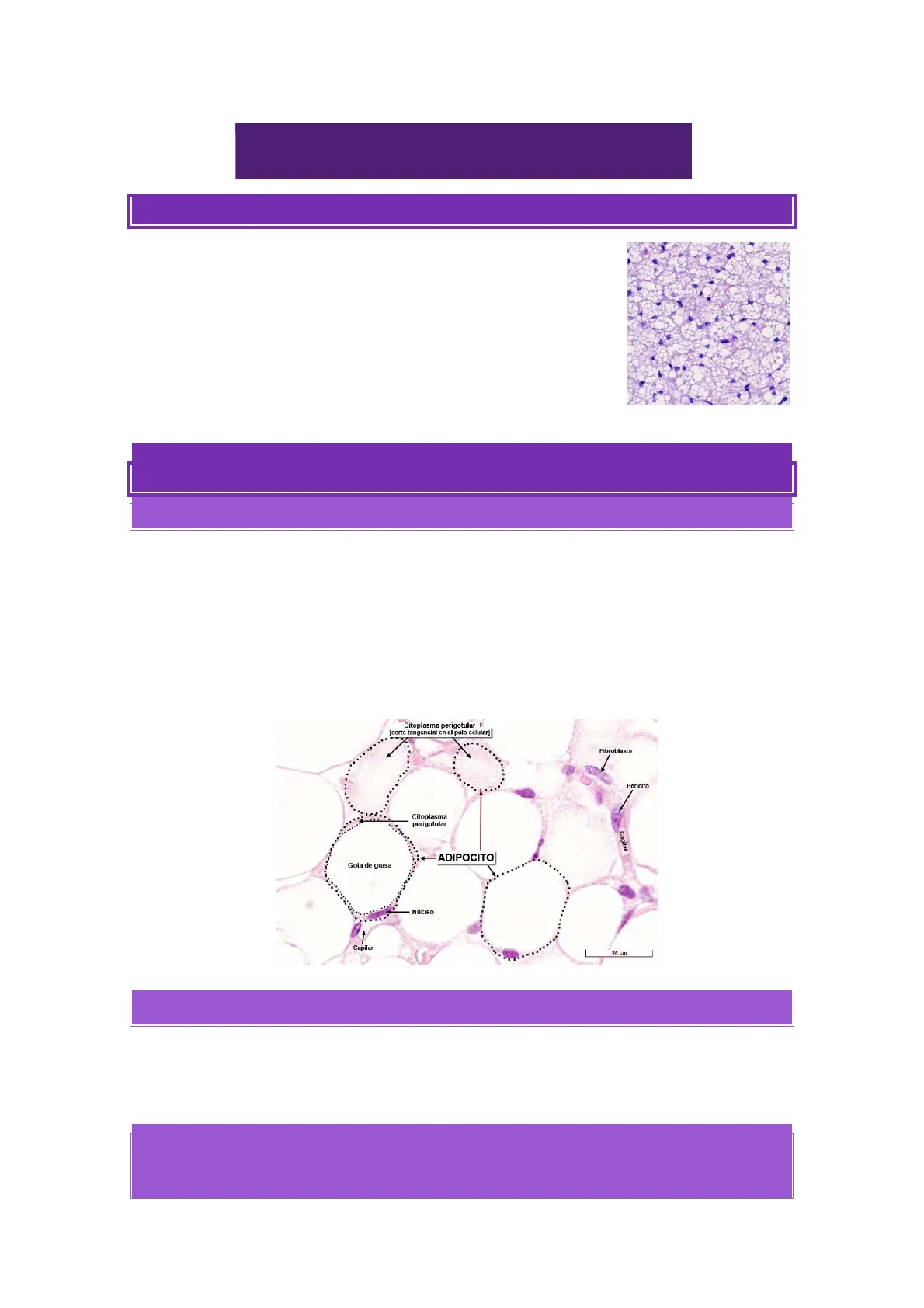 Células grandes, esferoidales con acumulación de lípidos, que aplanan y desplazan el núcleo. El citoplasma es un borde estrecho alrededor del lipido central. Aparato de Golgi pequeño, ribosomas libres, cisternas de RER cortas, microfilamentos y filamentos intermedios. Tambien hay mitocondrias alargadas y muchas siluetas de REL