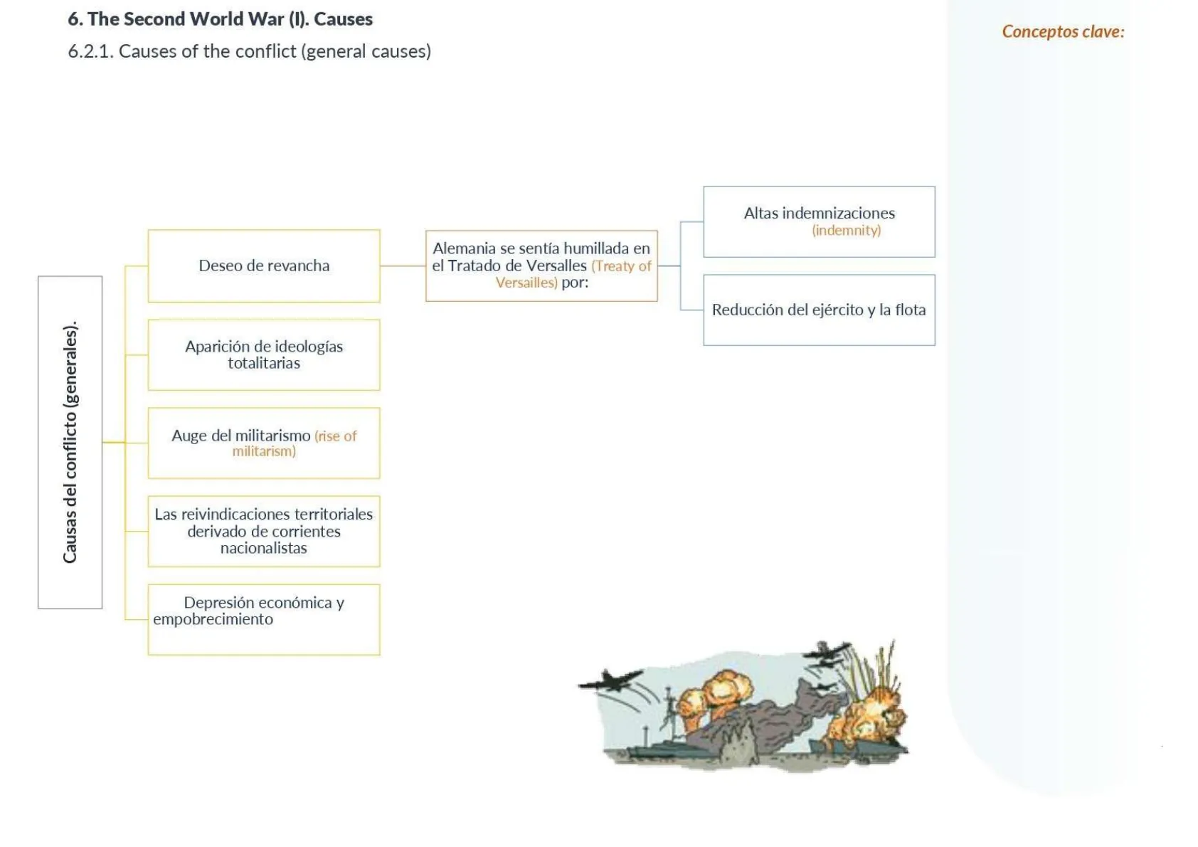 Conceptos clave: Altas indemnizaciones (indemnity) Deseo de revancha Alemania se sentía humillada en el Tratado de Versalles (Treaty of Versailles) por: Reducción del ejército y la flota Aparición de ideologías totalitarias Causas del conflicto (generales). Auge del militarismo (rise of militarism) Las reivindicaciones territoriales derivado de corrientes nacionalistas Depresión económica y empobrecimiento6. The Second World War (I). Causes