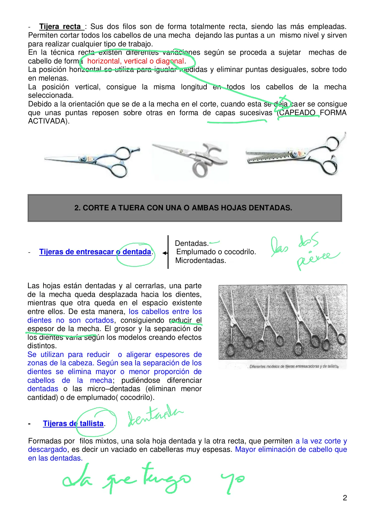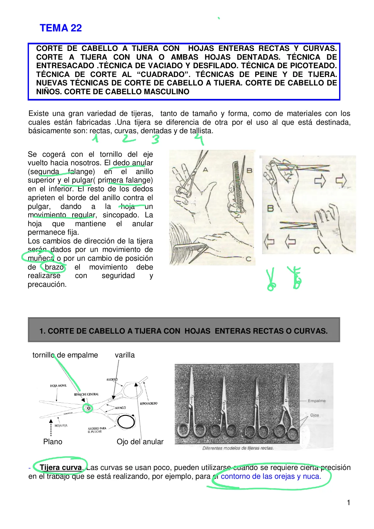 TEMA 22 CORTE DE CABELLO A TIJERA CON HOJAS ENTERAS RECTAS Y CURVAS. CORTE A TIJERA CON UNA O AMBAS HOJAS DENTADAS. TÉCNICA DE ENTRESACADO .TÉCNICA DE VACIADO Y DESFILADO. TÉCNICA DE PICOTEADO. TÉCNICA DE CORTE AL "CUADRADO". TÉCNICAS DE PEINE Y DE TIJERA. NUEVAS TÉCNICAS DE CORTE DE CABELLO A TIJERA. CORTE DE CABELLO DE NIÑOS. CORTE DE CABELLO MASCULINO Existe una gran variedad de tijeras, tanto de tamaño y forma, como de materiales con los cuales están fabricadas .Una tijera se diferencia de otra por el uso al que está destinada, básicamente son: rectas, curvas, dentadas y de tallista.