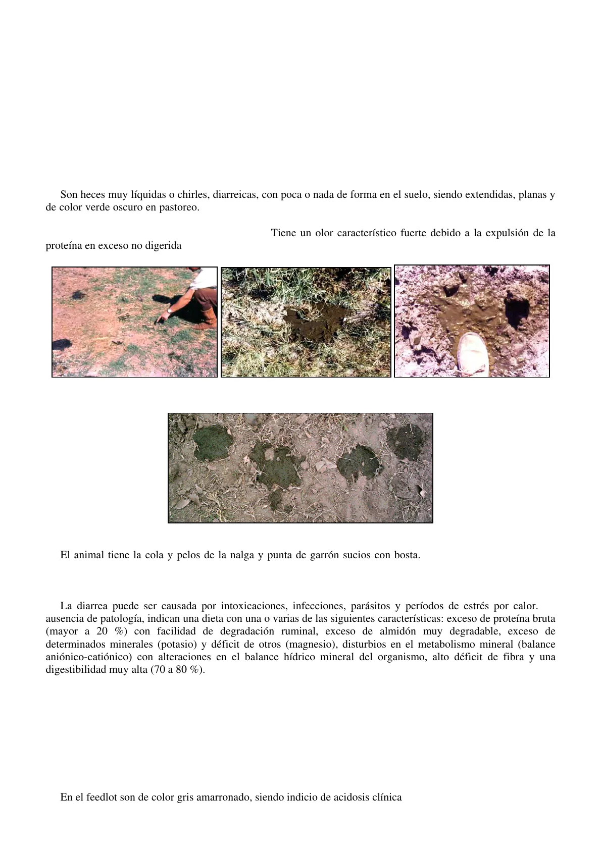 Novillitos en engorde a corral con alta ingestión de grano de maíz entero solamente: a) Deposición blanda, muy clara, con granos y fuerte olor; b) comederos con grano de maíz entero; observar el suelo con gran cantidad de granos de anteriores deposiciones