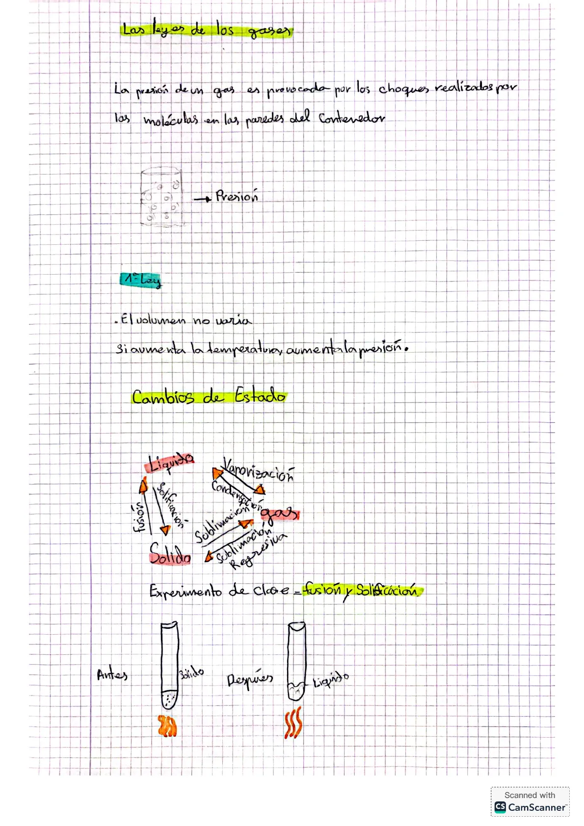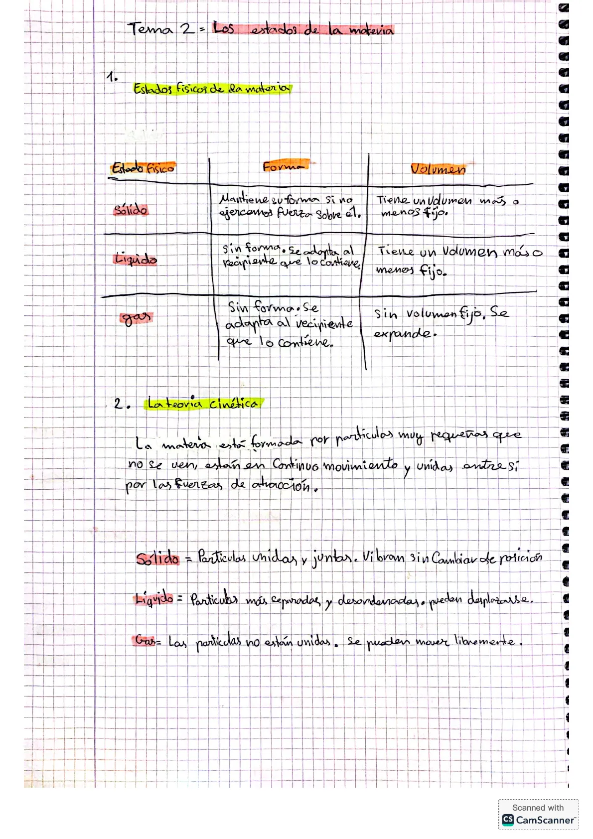 Documento de Cs Camscanner™ sobre Los estados de la materia. El Pdf, apto para Bachillerato en Ciencias, aborda los estados físicos, la teoría cinética y las leyes de los gases, incluyendo cambios de estado y clasificación de sistemas materiales.