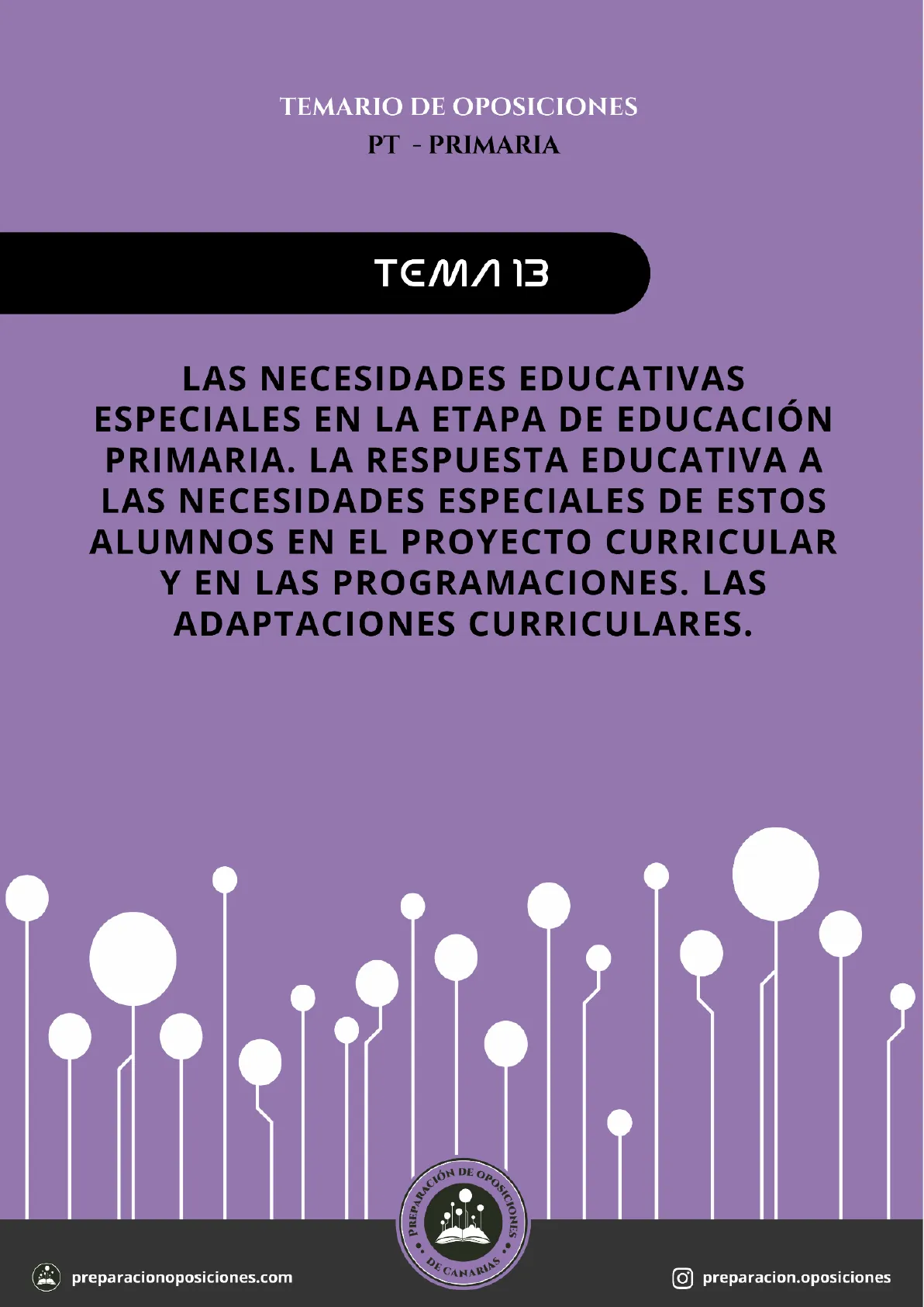 TEMARIO DE OPOSICIONES PT - PRIMARIA TEMA13 LAS NECESIDADES EDUCATIVAS ESPECIALES EN LA ETAPA DE EDUCACIÓN PRIMARIA. LA RESPUESTA EDUCATIVA A LAS NECESIDADES ESPECIALES DE ESTOS ALUMNOS EN EL PROYECTO CURRICULAR Y EN LAS PROGRAMACIONES. LAS ADAPTACIONES CURRICULARES. N DE CION OP OSICI PREPA NES DE CANARIAS preparacionoposiciones.com preparacion.oposicionesTEMA 13: Las necesidades educativas especiales en la etapa de Educación Primaria. La respuesta educativa a las necesidades especiales de estos alumnos en el proyecto curricular y en las programaciones. Las adaptaciones curriculares.