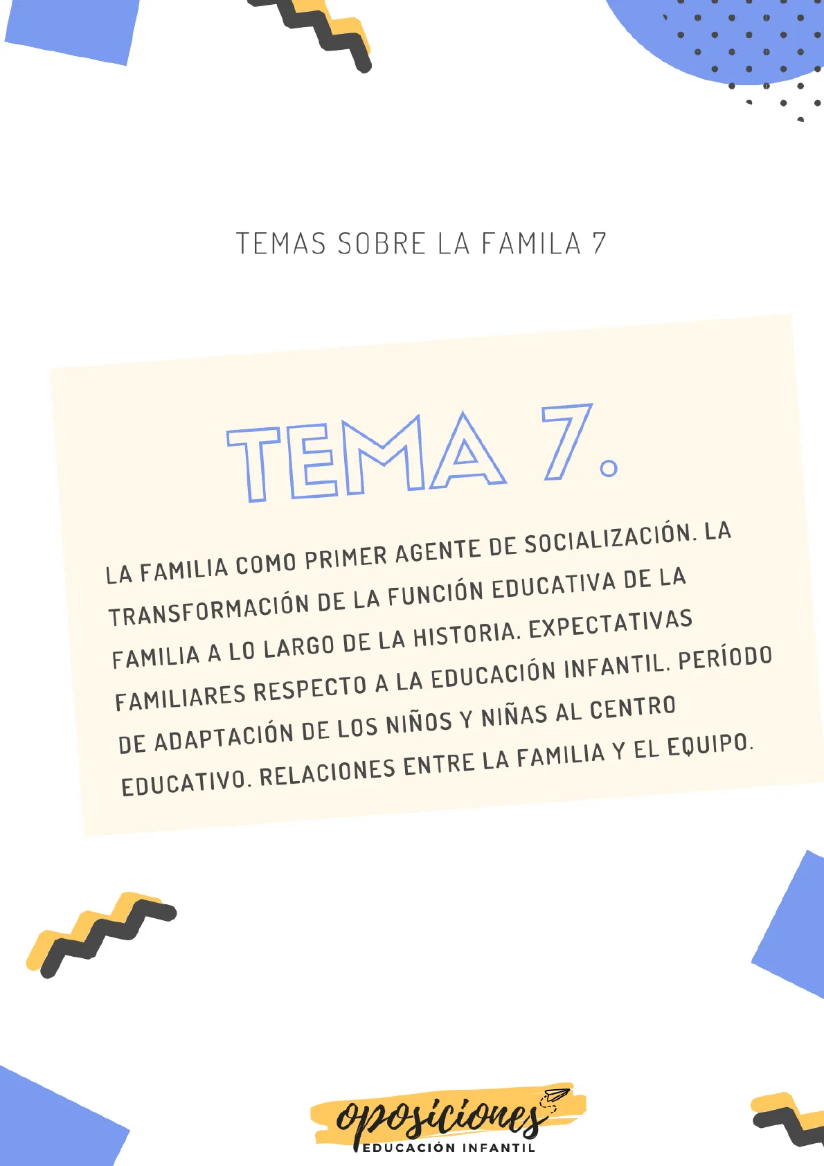 TEMA 7. LA FAMILIA COMO PRIMER AGENTE DE SOCIALIZACIÓN. LA TRANSFORMACIÓN DE LA FUNCIÓN EDUCATIVA DE LA FAMILIA A LO LARGO DE LA HISTORIA. EXPECTATIVAS FAMILIARES RESPECTO A LA EDUCACIÓN INFANTIL. PERÍODO DE ADAPTACIÓN DE LOS NIÑOS Y NIÑAS AL CENTRO EDUCATIVO. RELACIONES ENTRE LA FAMILIA Y EL EQUIPO. oposiciones EDUCACIÓN INFANTIL1. INTRODUCCIÓN El tema 7 se centra en las "La familia como primer agente socializador y hay que destacar que el presente tema tiene relación con todo el temario de infantil, pero especialmente con el tema 15 que trata sobre el papel del docente en las relaciones familia - escuela.
