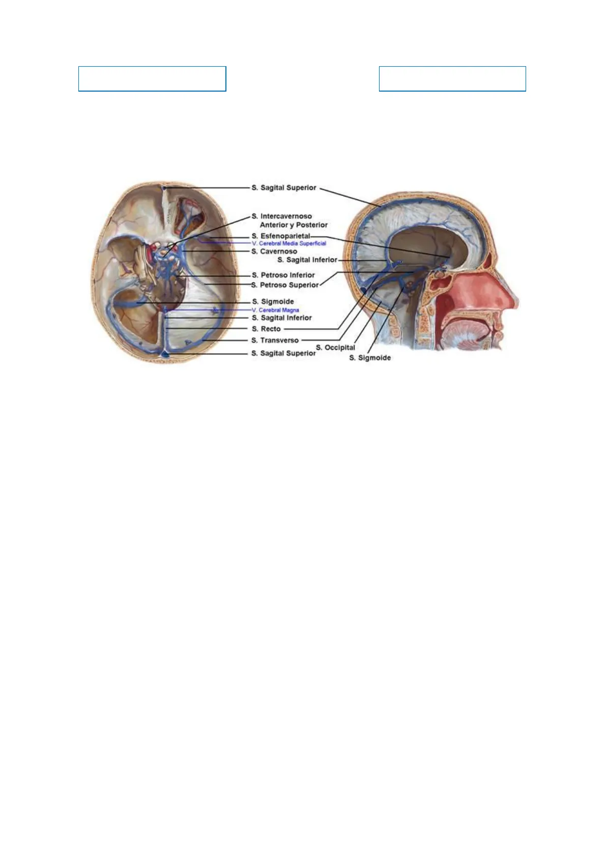 S. Sagital Superior - S. Intercavernoso Anterior y Posterior S. Esfenoparietal- -V. Cerebral Media Superficial S. Cavernoso S. Sagital Inferior S. Petroso Inferior S. Petroso Superior S. Sigmoide -V. Cerebral Magna S. Sagital Inferior S. Recto S. Transverso S. Occipital S. Sagital Superior S. Sigmoide