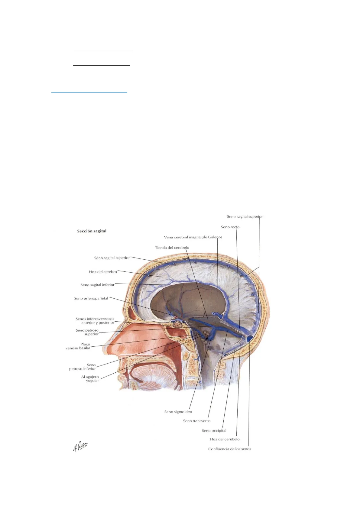 Seno sagital superior Seno recto Sección sagital Vena cerebral magna (de Galeno) Tienda del cerebelo Seno sagital superior Hoz del cerebro Seno sagital inferior Seno esfenoparietal Senos intercavernosos anterior y posterior Seno petroso superior Plexo venoso basilar Seno petroso inferior Al agujero yugular Seno sigmoideo Seno transverso Seno occipital Hoz del cerebelo Confluencia de los senos 7 NoterConfluencia anterior