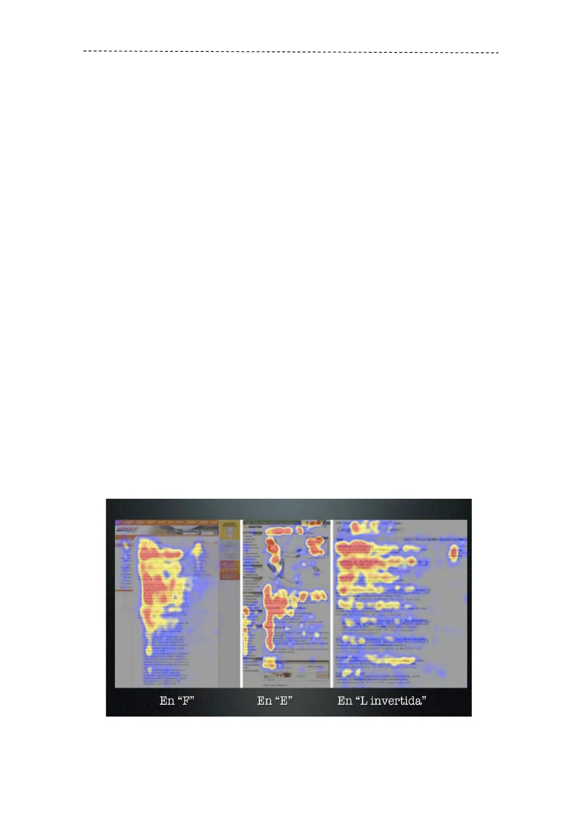 Imagen 1. Patrones de lectura web C M.ª Victoria Nuño Moral. Apuntes elaborados a partir de la bibliografía del plan de estudios.Redactor de cibermedios. Técnicas de redacción web Los diferentes ensayos han demostrado que el lector visualiza la información siguiendo un «patrón F». La lectura comienza en la parte superior de la pantalla, de izquierda a derecha; el lector regresa al margen izquierdo, descendiendo verticalmente y desplazándose de una manera más corta en la zona intermedia de la pantalla. Y de nuevo regresa al lado izquierdo haciendo un recorrido vertical hasta localizar un nuevo contenido que le pueda interesar.