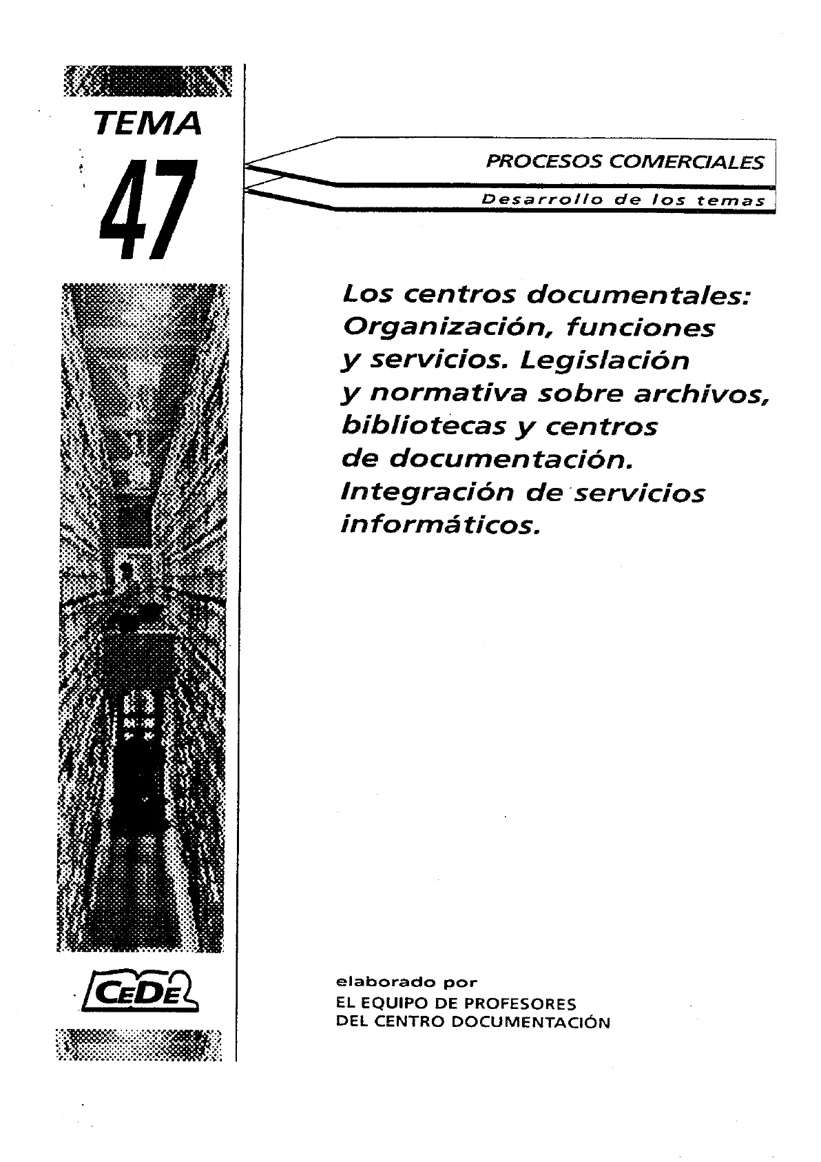 Documento de Cede sobre Los centros documentales: organización, funciones y servicios. El Pdf detalla la legislación y normativa que rigen archivos, bibliotecas y centros de documentación, así como la integración de servicios informáticos. Este material de Derecho de nivel universitario es útil para el estudio autónomo.
