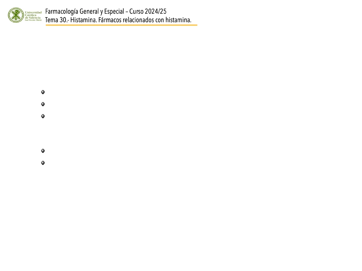 Universidad Católica de Valencia San Vicente Mártir Farmacología General y Especial - Curso 2024/25 Tema 30 .- Histamina. Fármacos relacionados con histamina. Efectos fisiofarmacológicos de la histamina ...